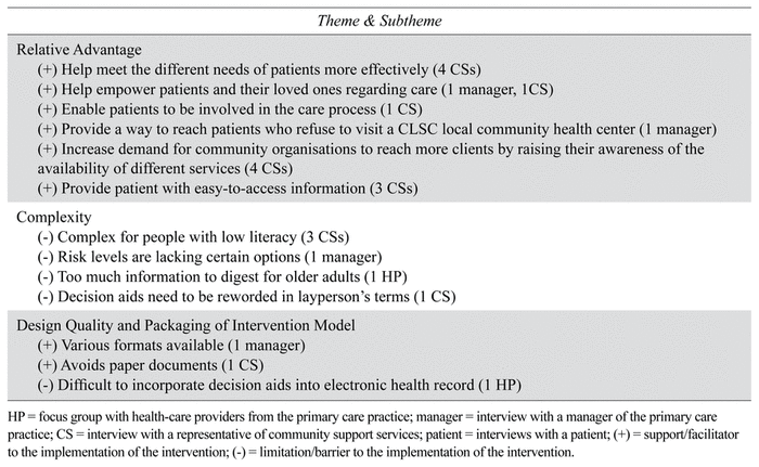 We recruited 28 patients, 29 HPs, and 8 managers from four primary care practices, 16 representatives from community-based services, and 10 representatives from geriatric clinics. Participants identified several factors that could influence adoption of the pathway: the availability of electronic and printed versions of the decision aids; the complexity of including a screening form in the electronic health record; public policies that limit the capacity of community-based services; HPs’ positive attitudes toward shared decision-making and their work overload; and lack of funding.