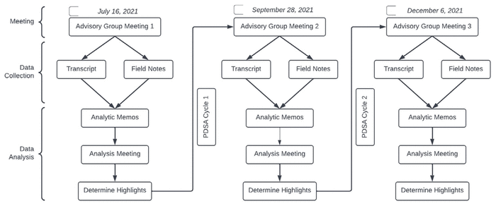 We used rapid qualitative analysis (Figure 1).(13,14) Data sources included Advisory Group meeting transcripts (audio recorded and transcribed verbatim) and meeting field notes completed by the research team/staff. Five research team members (LM, LH, BF, WT, EG) read meeting transcripts and field notes, then wrote analytical memos (Appendix A). They then reviewed all analytical memos and met virtually to gain consensus on themes. Analytical memos and transcripts from the analysis meetings were used by three team members (LM, BF, WT) to summarize site experiences and overall themes, which were subsequently confirmed by the Advisory Group.