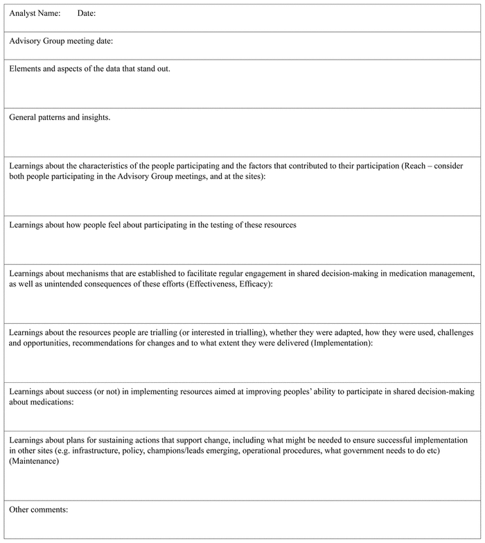 Instructions: Investigators and staff will create analytical memos as they read through the Advisory Group transcripts and field notes. Analysts will notice interesting patterns in the data, or will experience insights into the meaning of the data, and will record this information in a memo. These analytical memos will inform subsequent Advisory Group meetings.