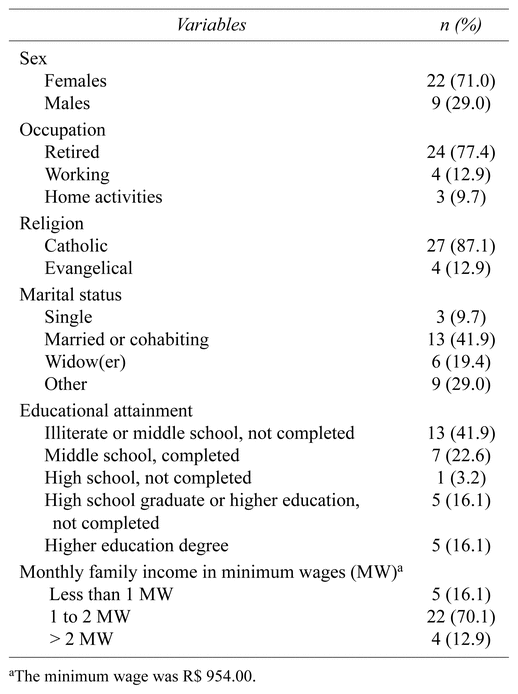 TABLE 1 Sociodemographic and economic characteristics of assessed older adults (n = 31), Petrolina, Pernambuco, Brazil, 2018