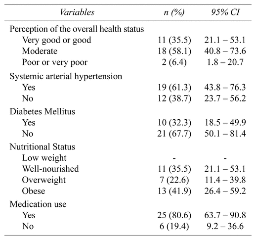 TABLE 2 Characterization of the older people regarding their self-perception of the overall health status, comorbidities, nutritional status, and medication use (n = 31), Petrolina, Pernambuco, Brazil, 2018
