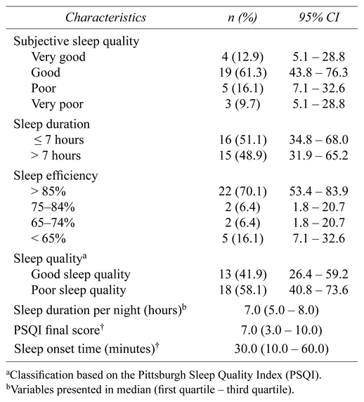 TABLE 3 Variables regarding the sleep quality of assessed older people (n = 31), Petrolina, Pernambuco, Brazil, 2018