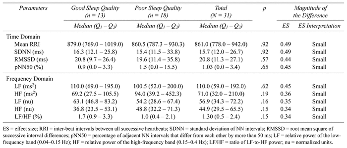 TABLE 4 Comparison of time- and frequency-domain heart rate variability parameters and effect size among older people with good and poor sleep quality (n = 31), Petrolina, Pernambuco, Brazil, 2018