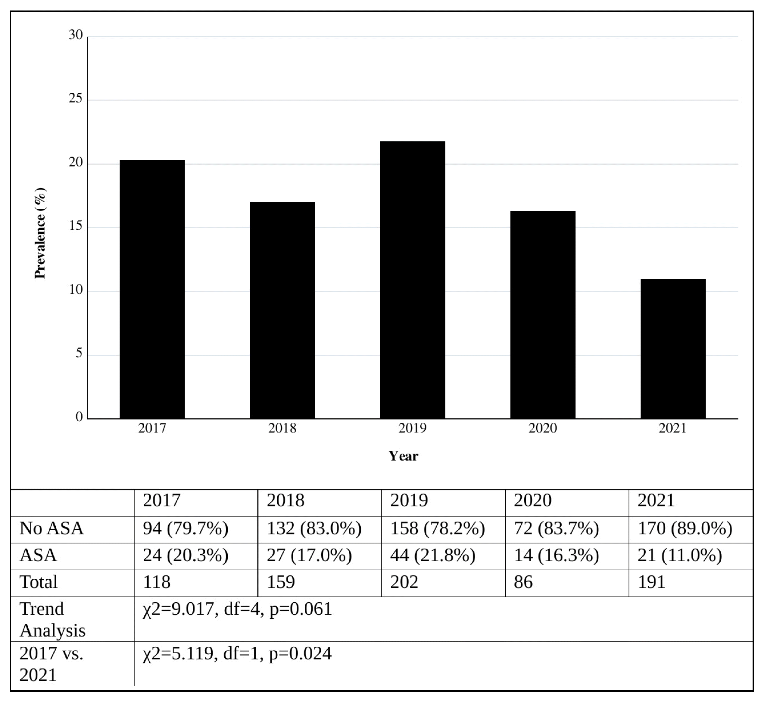Categorical data were reported as frequencies with percentages. Continuous data were reported as means with a standard deviation (SD). Ordinal data were reported as medians with an interquartile range (IQR). Baseline characteristics were compared with an independent sample t-test for continuous data, Mann-Whitney U test for ordinal data, and chi-squared analysis for categorical data. A chi-squared analysis with a Bonferroni correction for multiple comparisons was used to assess the change in prevalence rates across all years (2017 to 2021). A chi-squared analysis was also used to compare the difference in ASA prevalence rates between 2017 and 2021. A forward stepwise multivariate logistic regression was performed to assess the impact of older age (70 years and older), sex, dementia, and vascular risk factors (hypertension, dyslipidemia, diabetes mellitus, chronic kidney disease, tobacco use) on ASA use. Age, sex, and any of the aforementioned factors (dementia, hypertension, dyslipidemia, diabetes mellitus, chronic kidney disease, tobacco use) with a p value of < .10 were included in the logistic regression model. Frailty was originally planned to be included in the regression model but was removed due to the number of missing values for this variable. The missing data points for tobacco use were excluded from the analysis as they made up less than 1% of the overall population. A p value of < .05 was considered to be statistically significant. Cohen’s kappa was used to assess interrater reliability. IBM SPSS Statistics (version 28, IBM Corporation, Armonk, NY) was used for all statistical analyses.