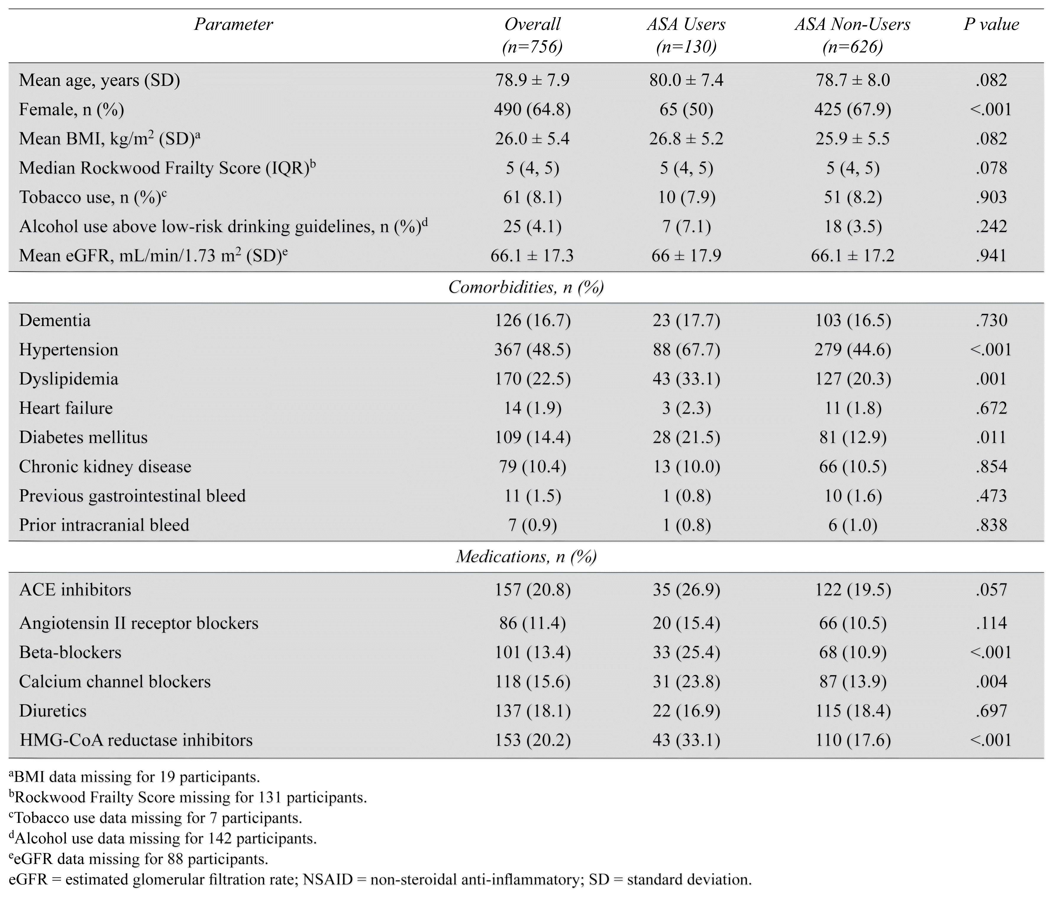 The mean age of participants was 78.9 years (SD 7.9 years) and 64.8% percent were female (Table 1). Participants had a median clinical frailty score of 5 (IQR 4, 5) and 48.5%, 22.5%, and 14.4% had a recorded diagnosis of hypertension, dyslipidemia, and diabetes mellitus, respectively. Individuals who used ASA were more likely to be male (50% vs. 32.1%, p < .001), have a diagnosis of hypertension (67.7% vs. 44.6%, p < .001), dyslipidemia (33.1% vs. 20.3%, p = .001) and diabetes mellitus (21.5% vs. 12.9%, p = .011), and taking HMG-CoA reductase inhibitors (33.1% vs. 17.6%, p < .001), beta-blockers (25.4% vs. 10.9%, p < .001), and calcium channel blockers (23.8% vs. 13.9%, p = .004).