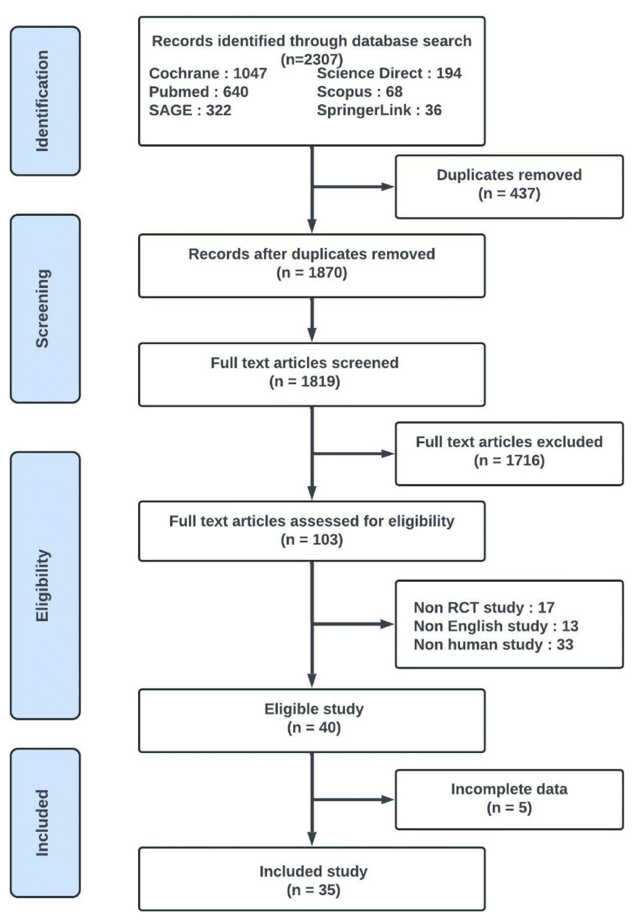 Our preliminary article search returned 2,307 results. After duplicates and abstracts were excluded, 1,819 full-texts were identified and 103 studies were assessed for eligibility. The meta-analysis and systematic review included 35 studies. Figure 1 shows the flowchart for the included study.