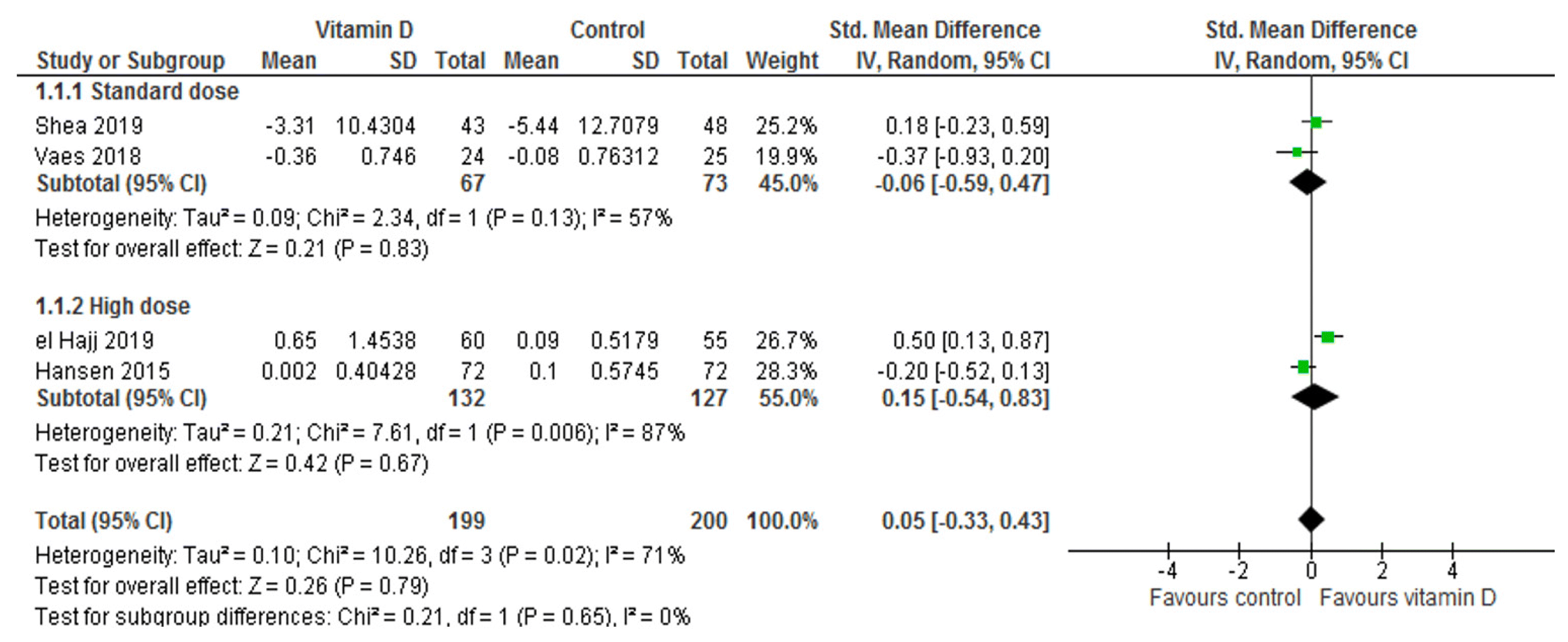 Compared with the placebo, vitamin D supplementation did not affect appendicular skeletal muscle mass (SMD = .05 [95% CI, −.33 – .43], p = .79). In subgroup analysis, neither the standard dose nor the high dose of vitamin D supplementation showed muscle mass improvement. However, heterogeneity was high (p = .02; I2 = 71%)