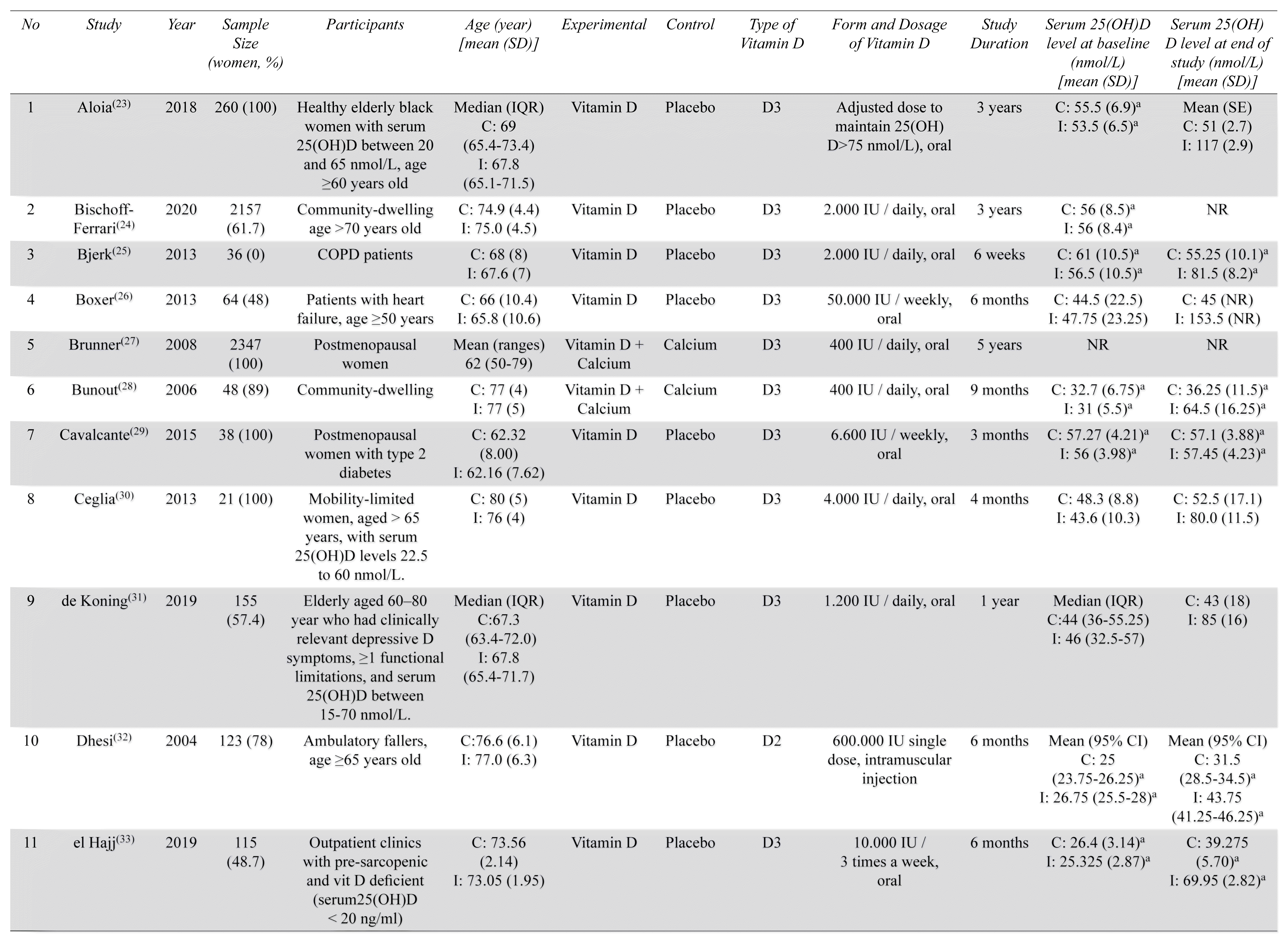 The inclusion criteria were randomized controlled trials (RCTs) or controlled trials which studied the effect of vitamin D on muscle mass, muscle strength, and physical performance. Case reports, case series, non-English studies, and non-human studies were excluded.