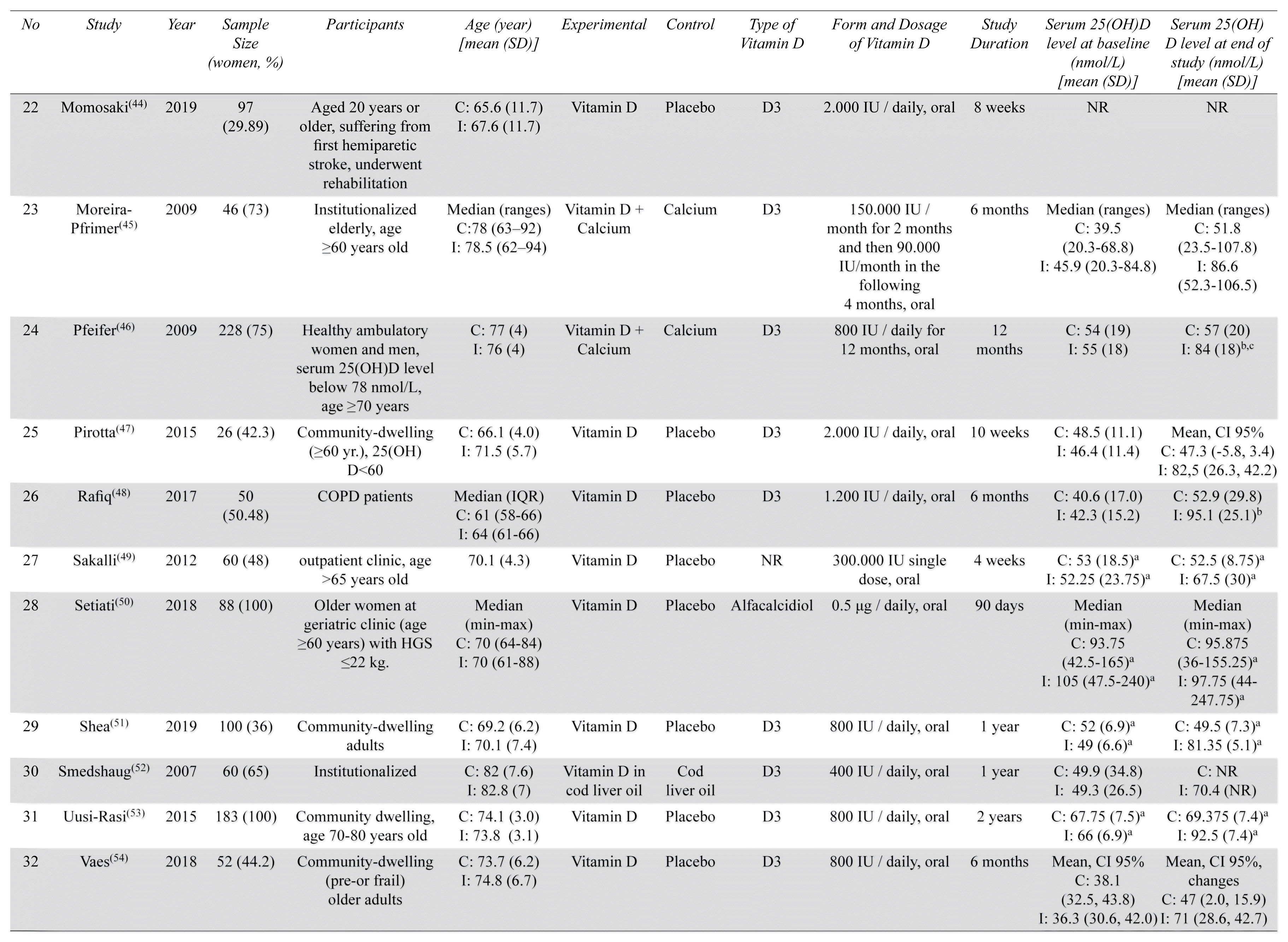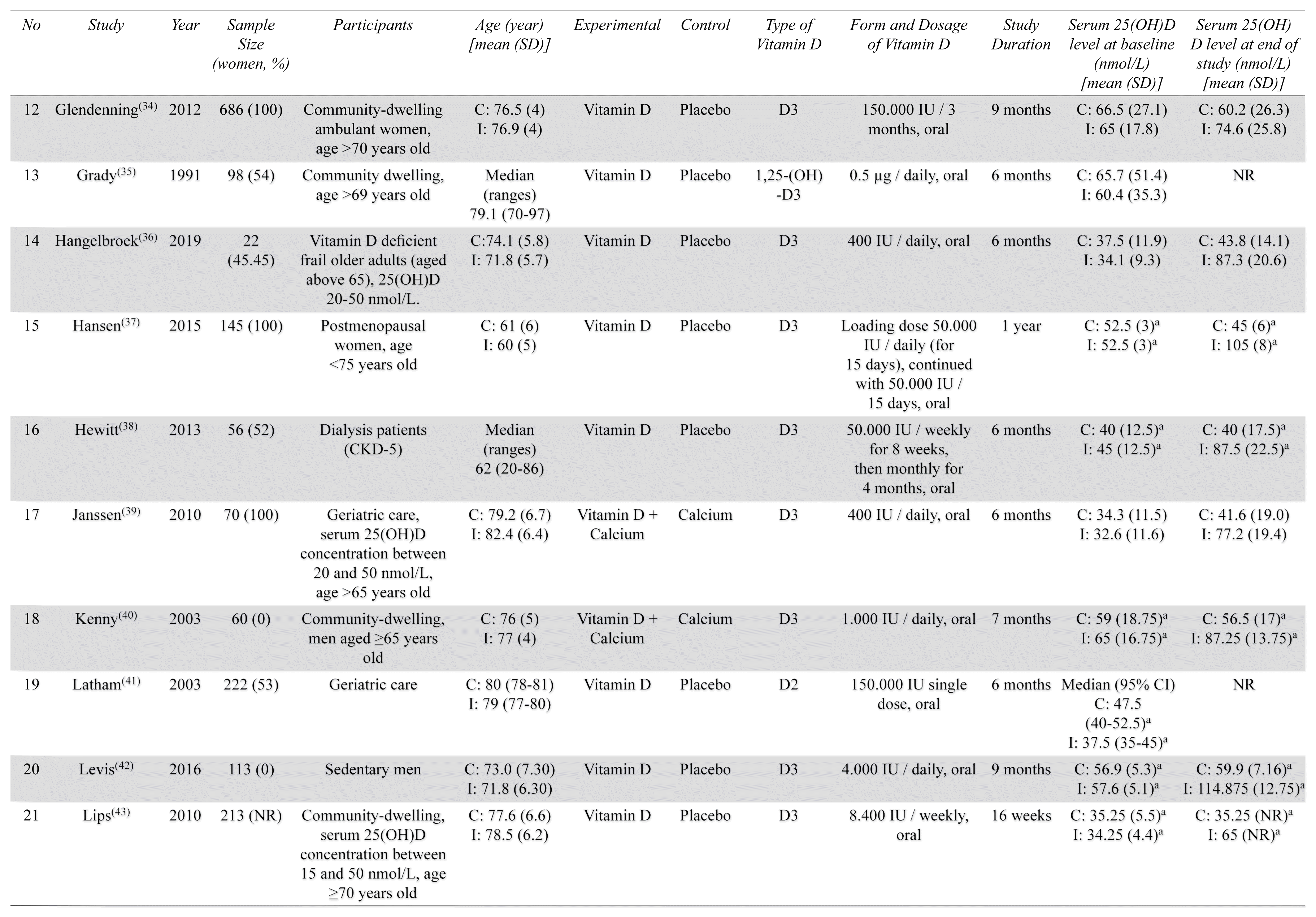 Two authors (N.H.S. and R.R.) independently extracted the data from the selected studies using Microsoft Excel. The data included: the title of the journal, authors and years of publication, country/geographic areas, length of study, follow-up interval and frequency, randomization, source of bias, population (number of samples, age, sex, ethnicity, comorbidity, setting (outpatient/inpatient)), intervention (doses and forms of vitamin D supplementation, duration of intervention), outcomes (muscle mass, muscle strength, and physical performance, baseline and post-study serum (25(OH)D levels). Based on these data, subgroup analysis was predetermined.