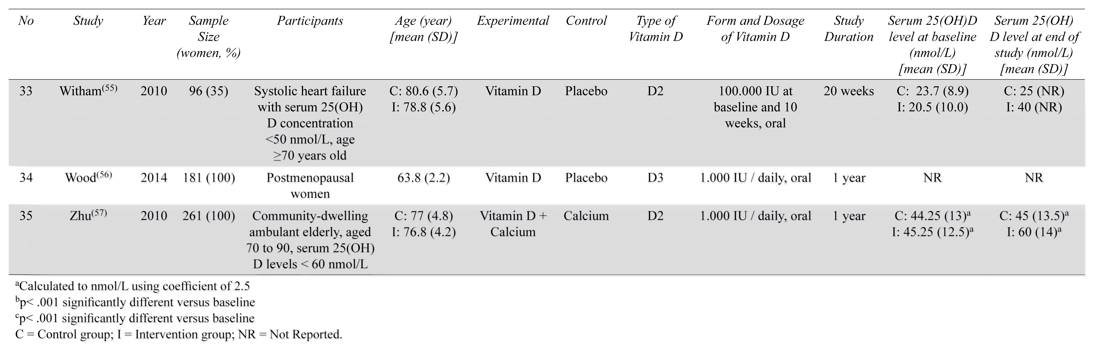 Table 1 presents the characteristics of the 35 studies. Out of those 35 randomized controlled trials involving 6,628 participants, 3,303 were assigned as a control group and 3,325 were assigned as an intervention group. Vitamin D3 was used in 29 studies,(23–50) vitamin D2 in four studies,(51–54) alfacalcidol was used as supplementation in one study,(55) 1, 25 dihydroxy vitamin D in one study,(56) and a study did not report the type of vitamin D used.(57) The majority of studies supplemented participants with vitamin D orally, whereas only one study supplemented participants with intramuscular injection.(51) The doses used are evenly distributed below or above 4000 IU per day, and the treatment duration ranged from one to sixty months. There were six studies involving vitamin D supplementation at high doses.(28,31,44,48,50,57) There were 18 studies that included vitamin Deficiency individuals’ serum 25(OH)D levels below 50 nmol/L,(23,25,27–30,33,35,36,38,40,42,44,45,49,51,52,54) and three studies did not report the baseline serum 25(OH)D levels(33,43,45)