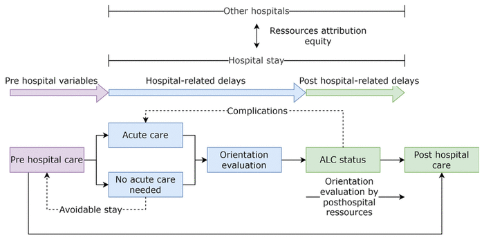 The optimization of the care trajectory of ALC patients is mainly based on pre-hospital and post-hospital factors. A proportion of ALC admissions might be avoidable with additional investment in home care resources and relocation procedures. Fluidity of ALC trajectory may benefit from improved orientation at discharge procedures. Full optimization of ALC trajectories requires a systemic understanding of the health-care system.