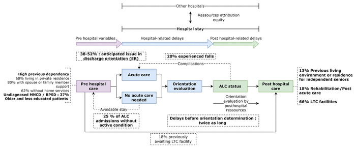 As expected, we found that patients with ALC status have longer lengths of stay than those without ALC.(11) Adverse outcomes have previously been demonstrated for ALC patients,(7,20) and we observed a higher prevalence of falls during hospitalization among this group. Although many patients with anticipated orientation discharge issues were identified by emergency and geriatric teams at the initial consultation, ALC patients remained with prolonged stays. Time to medical stabilization and to mobility stability did not appear to influence ALC status; longer delays before cognitive stabilization of ALC group might be attributable to the excess of new cognitive diagnoses. The longest delay within the acute hospital setting was related to the determination of discharge destination. In addition to the presence of NCD or BPSD,(17,18) we found that this delay was mainly influenced by post-hospital factors—in particular, the assessment by the social services and the nursing home attribution system. We were unable to identify any significant difference that could serve as a target during the hospital stay itself. An emergent avenue could be to avoid the hospital stay; there has been enthusiasm around the concept of “hospital at home”, where patients presenting with predetermined medical conditions receive required care at home, avoiding hospital stays as much as possible.(21)
