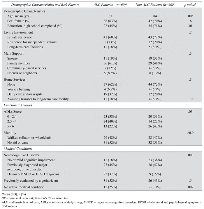 A case-control design was used to compare 60 ALC and 60 non-ALC patients admitted to the geriatric unit of the Centre hospitalier de l’Université de Montréal in 2021, collecting medical and sociodemographic data. Based on our model, univariate statistical analyses were computed to compare groups and identify risk factors for ALC status.