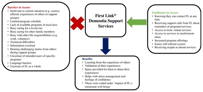 Barriers were identified by participants when explaining their lack of engagement in certain programs or the First Link dementia support services in general. These were due to factors such as time constraints, as they had other responsibilities or commitments in their life that prevented them from connecting with the services, or limitations in the program offerings. Some participants also reported that they were uncertain about the services’ intended users or felt that the support provided was not needed in their current situation. Figure 1 outlines the barriers and facilitators to access and engagement with the First Link dementia support services experienced by participants.