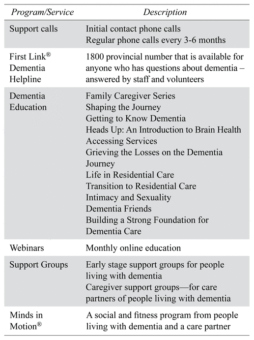 TABLE 1 Full list of First Link dementia support services offered by the Alzheimer Society of BC