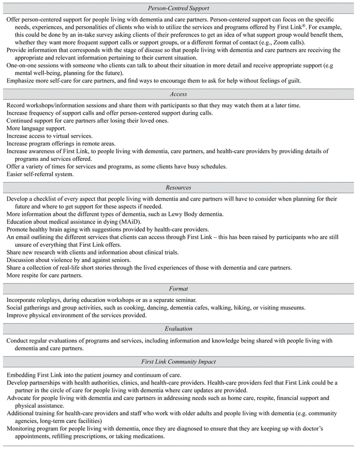 Table 2 summarizes a list of recommendations provided by participants specific to the First Link dementia support services that can be applied to other related dementia programs and services.