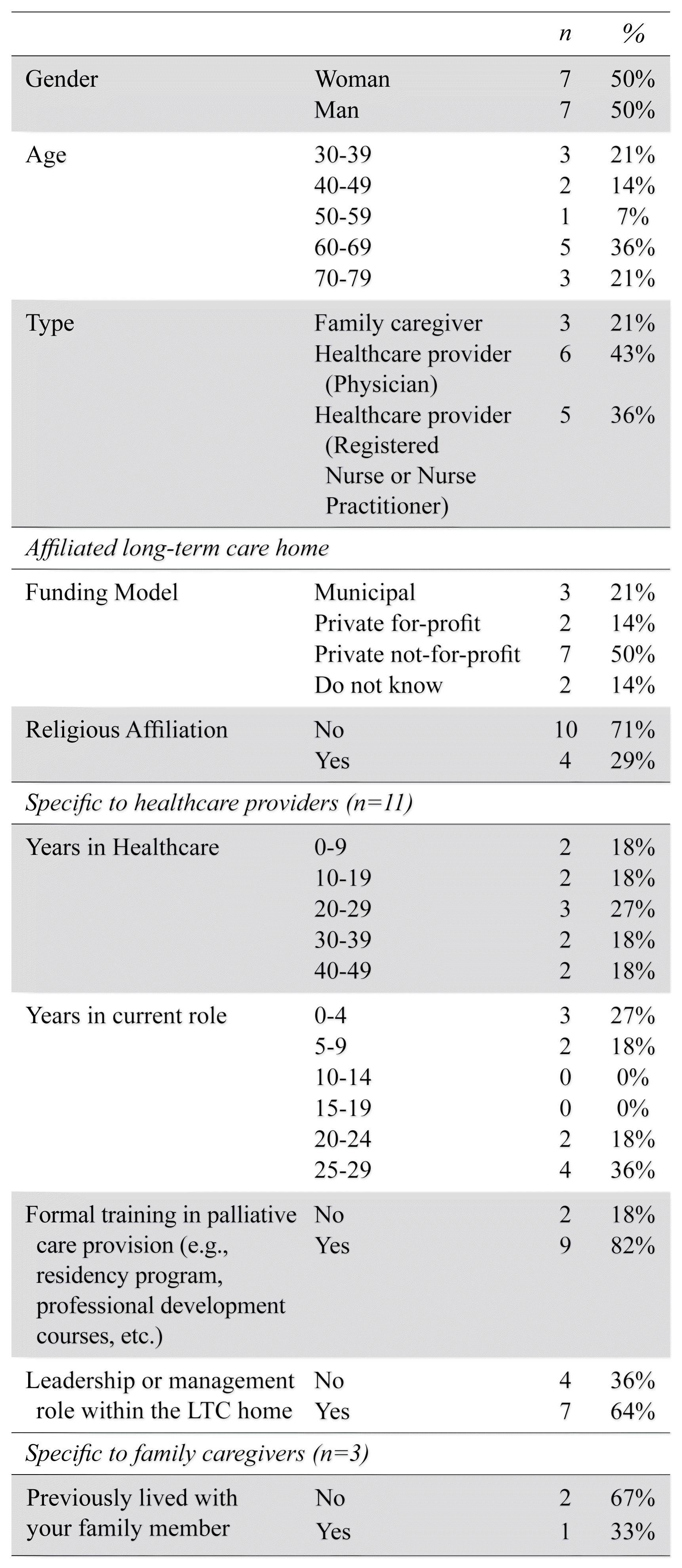 We interviewed 15 participants, 14 from Ontario and one from Alberta. We excluded the single Alberta transcript from our analysis as the interview suggested differences in practice across provinces. We determined we could not fully capture those differences with only one interview. Of the Ontario transcripts, there were six physicians, five nurses, and three family caregivers from seven of Ontario’s 626 LTC homes. Of the Ontarian participants, half (n=7, 50%) were female, and a third (n=5, 36%) were aged 60 to 69. Half (n=7, 50%) were from private not-for-profit LTC homes, and the majority (n=10, 71%) were from non-religious LTC homes. Of the health-care providers (n=11), the majority (n=9, 81%) had previous palliative care training (e.g., residency program or professional development courses) and were in a managerial or leadership role within their home (n=7, 64%). Participant demographics are in Table 1. The average interview length was 40 minutes (24 to 51 minutes).