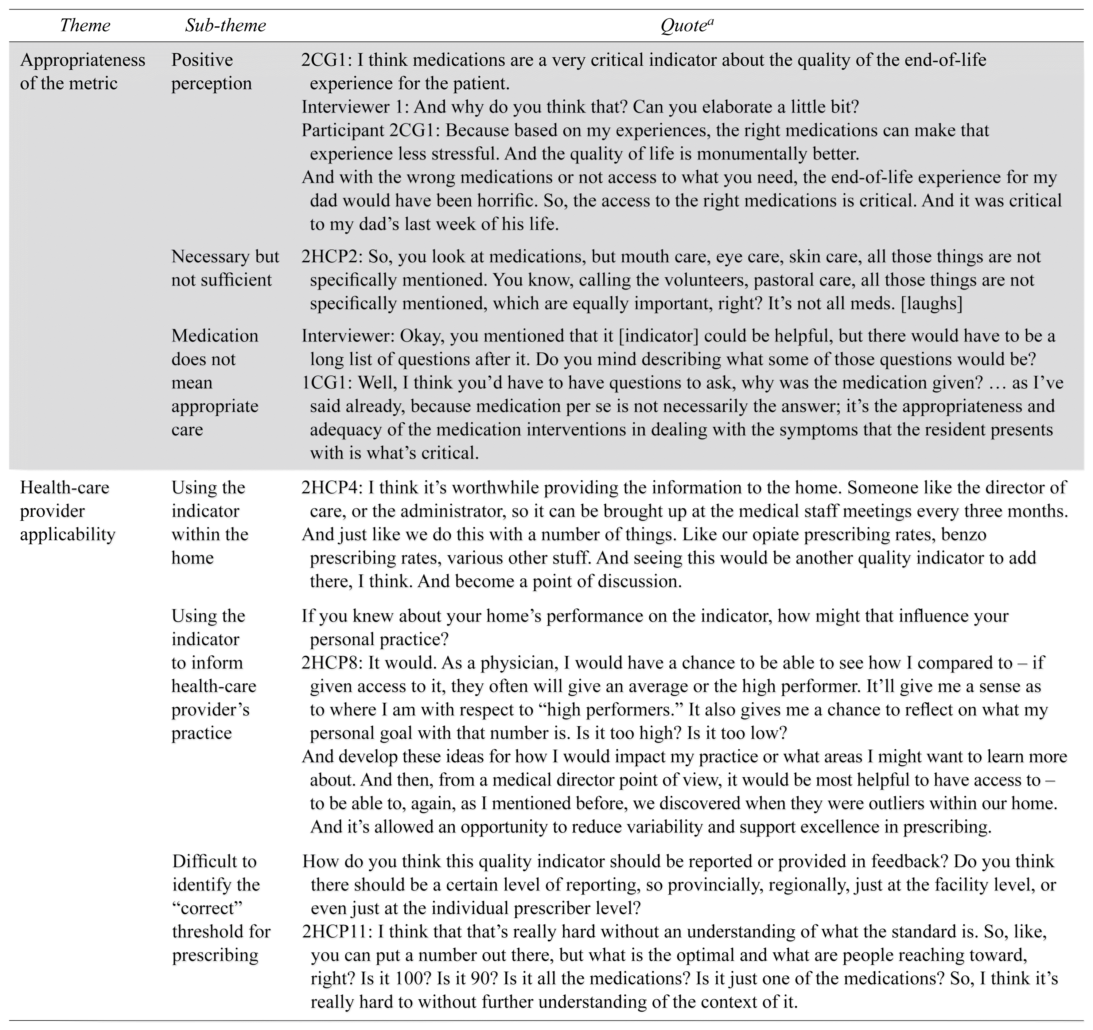 Health-care providers stated that to use the metric, they would need a defined prescribing range or threshold that indicates “good” practice. However, none of the participants could ascertain or estimate the right range or threshold to indicate quality end-of-life care. Interviewees said that, while they use medications to manage residents’ symptoms, they felt that a situation wherein 100% of LTC residents were prescribed an end-of-life symptom management medication before death would not be ideal. They shared instances where medication is not—and should not—be prescribed as some residents die suddenly, some do not experience symptoms which require medications, and in other circumstances, the medications do not align with the patient or caregivers’ preferences.