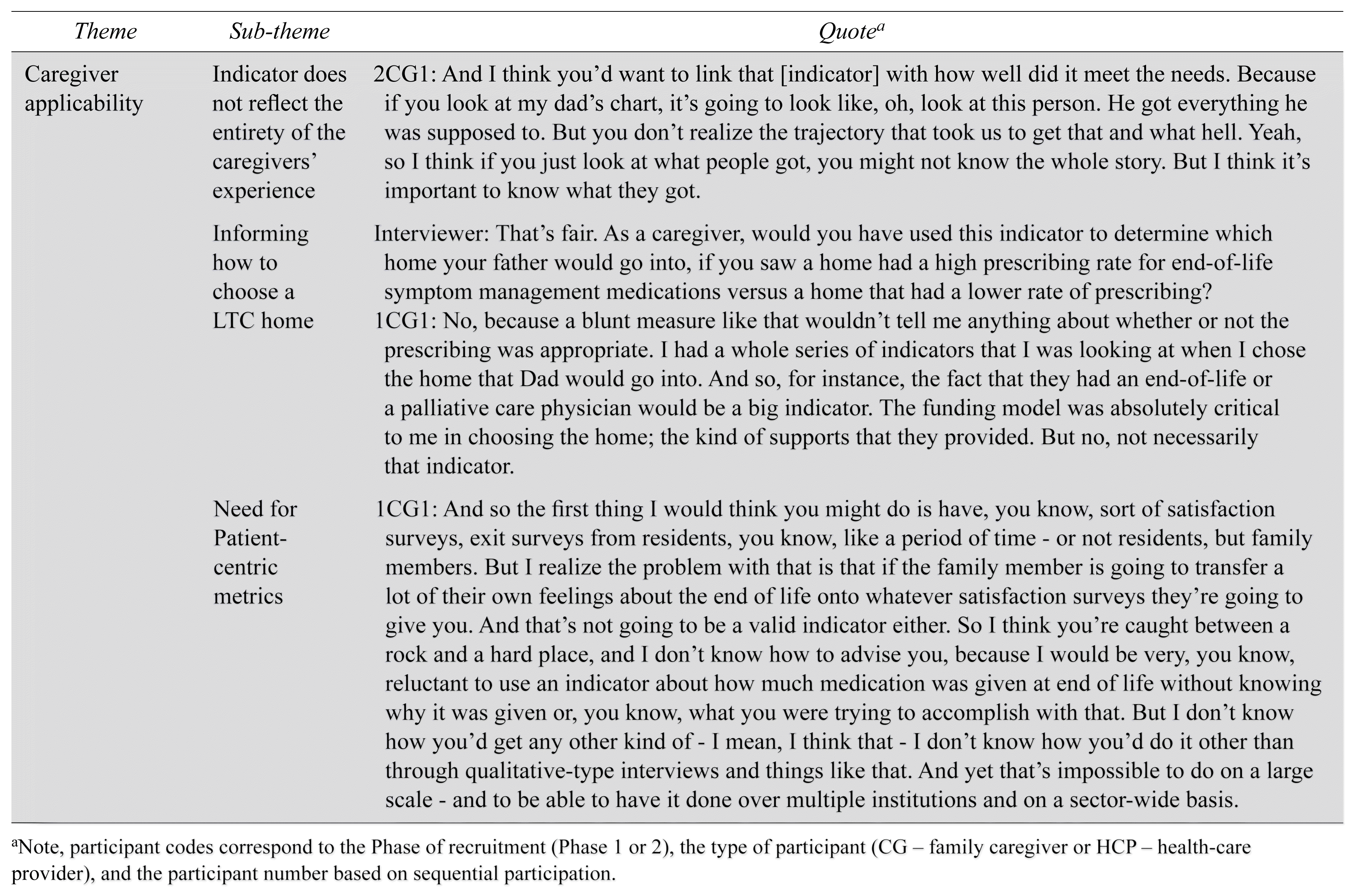 In this study, we interviewed LTC health-care providers and caregivers of deceased LTC residents to determine the acceptability and applicability of an end-of-life prescribing metric. This study identified three themes for considering this metric’s potential use and ability to assess end-of-life care within LTC. First, the metric can identify some aspects of end-of-life care but is not an absolute measure. Second, the metric can be used by health-care providers or LTC homes to compare their practice to others, but it is necessary to define and establish an acceptable range or threshold. Finally, the metric does not sufficiently reflect the caregiver’s experience, and caregivers offered suggestions for more meaningful metrics.