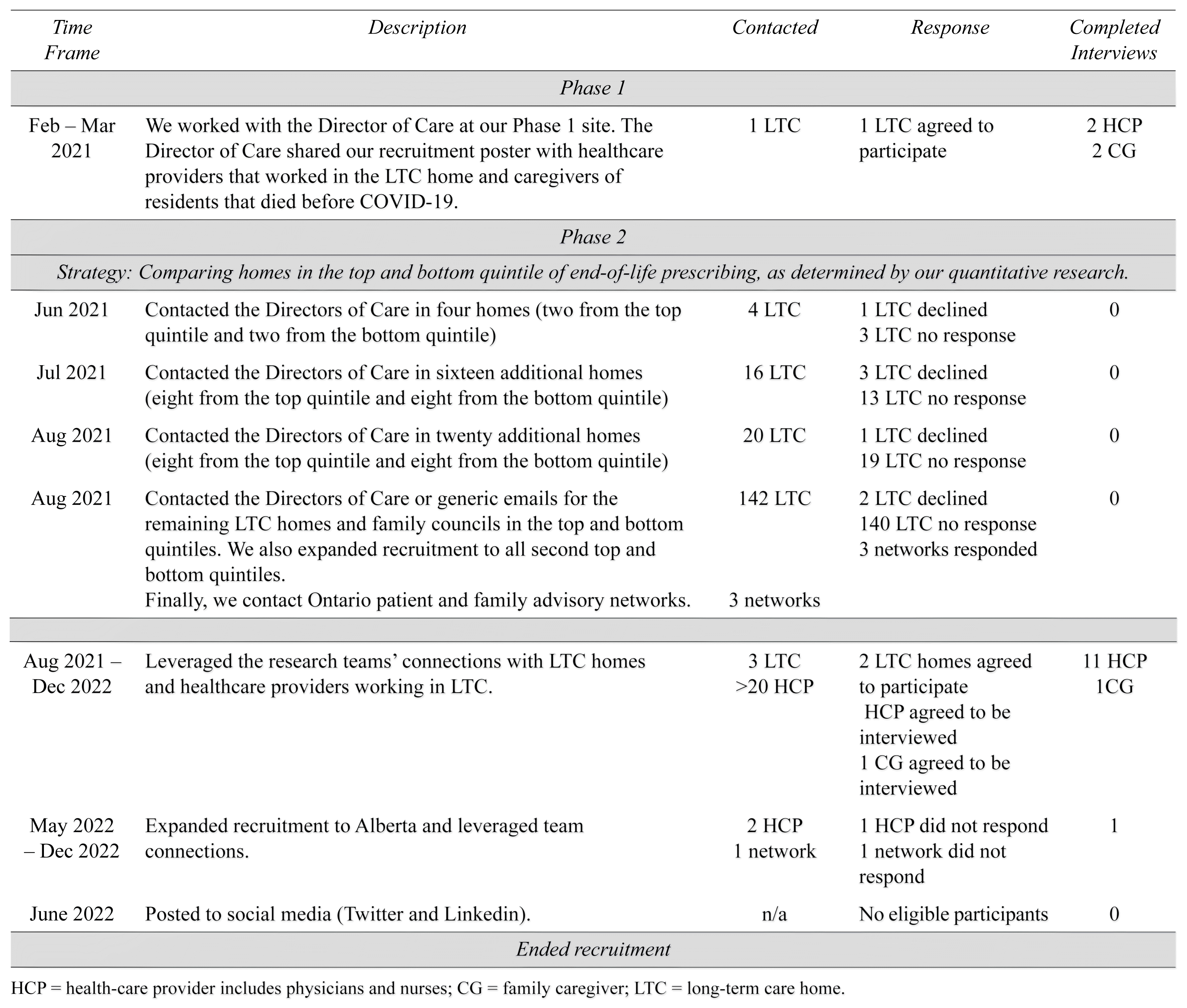 In Phase 1, we recruited participants from a single LTC home (February to March 2021). In Phase 2, we started by recruiting participants from homes with the highest and lowest prescribing rates as identified through our quantitative analyses (June to August 2021). However, due to low response rates, we expanded our recruitment to all Ontario LTC homes and to Alberta LTC homes where the research team had professional connections (August 2021 to November 2022). A further description of our recruitment strategy is in Appendix A.