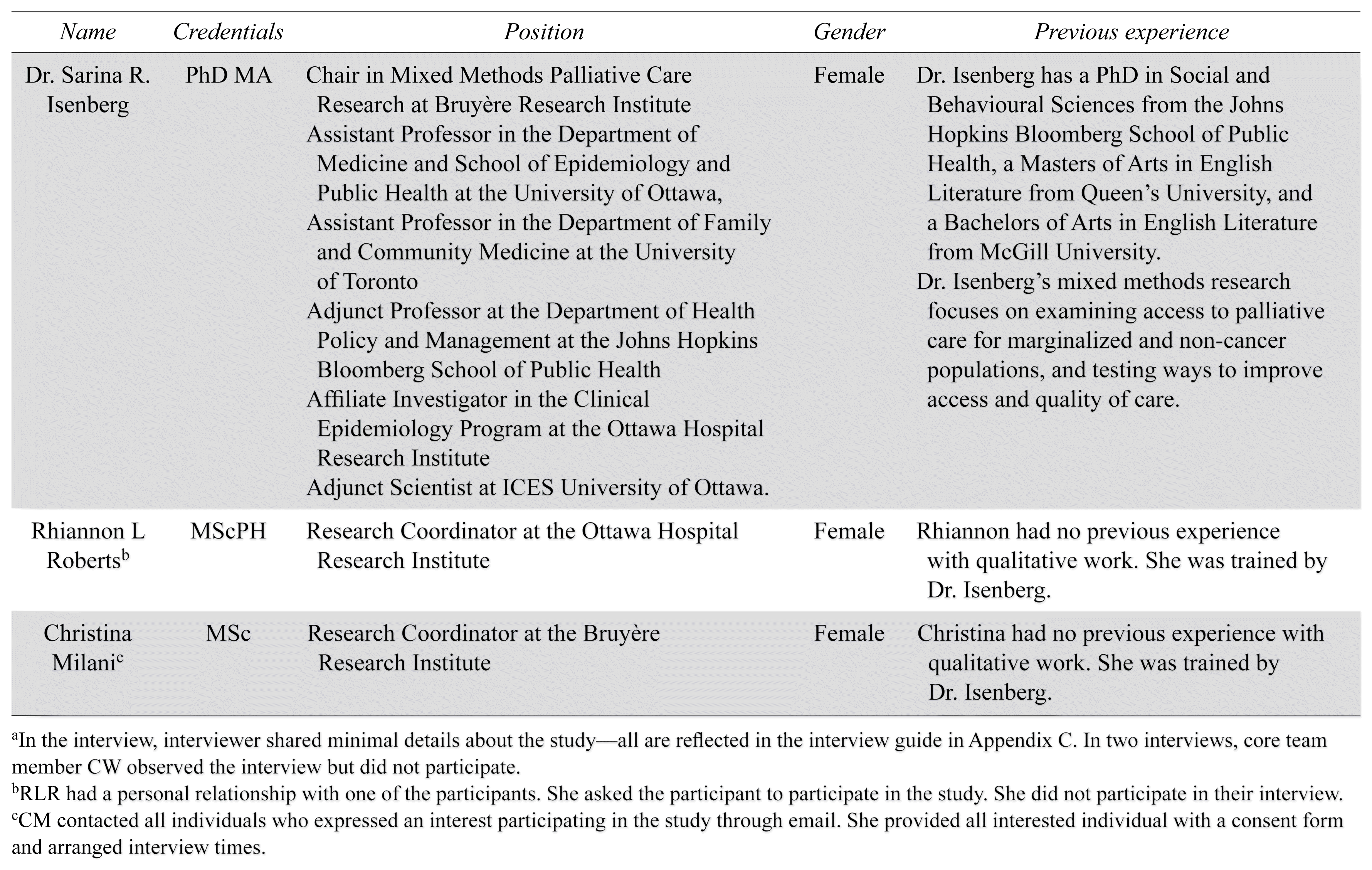 The following three individuals conducted the interviewsa. Their characteristics reflect those at the time of the interviews.