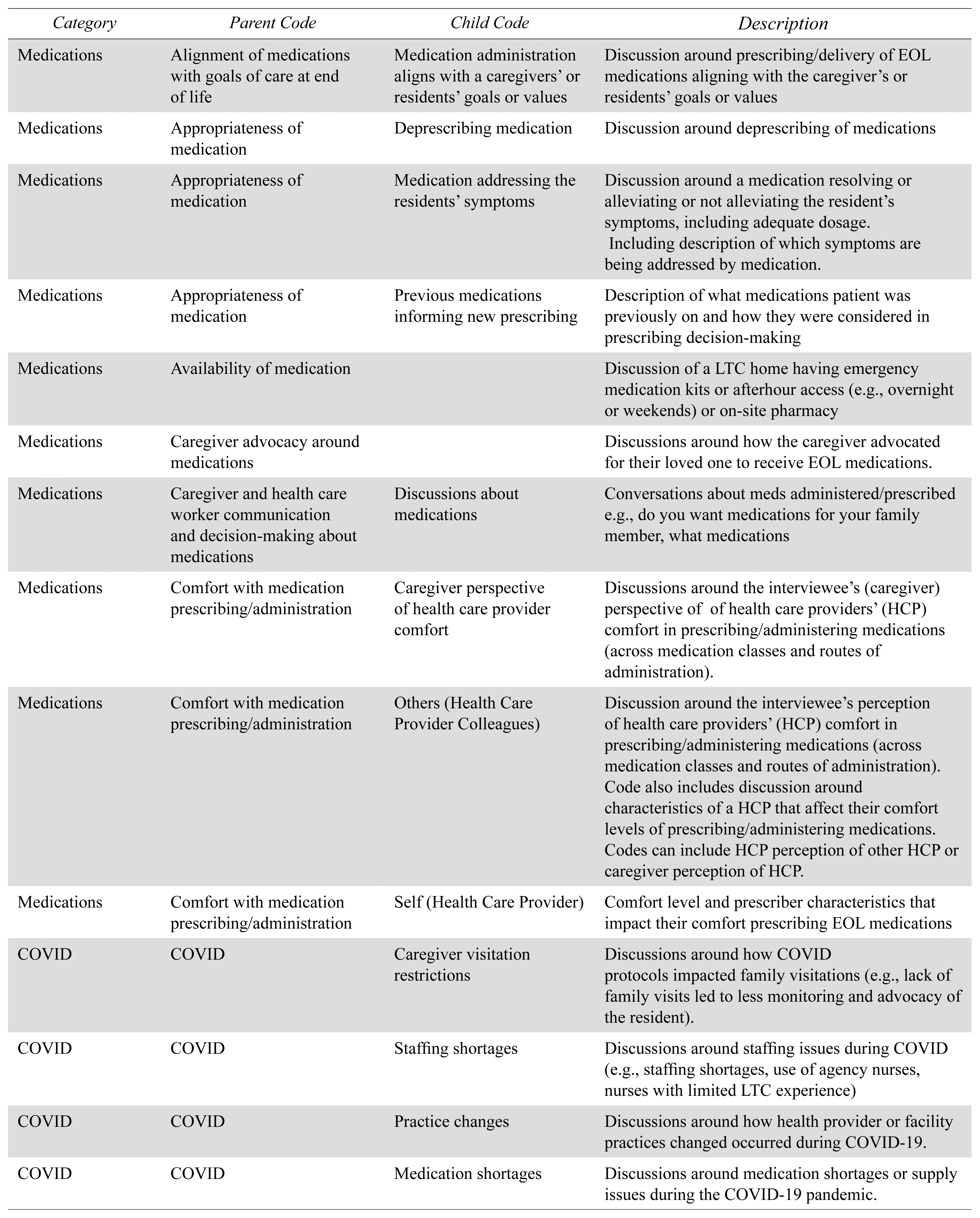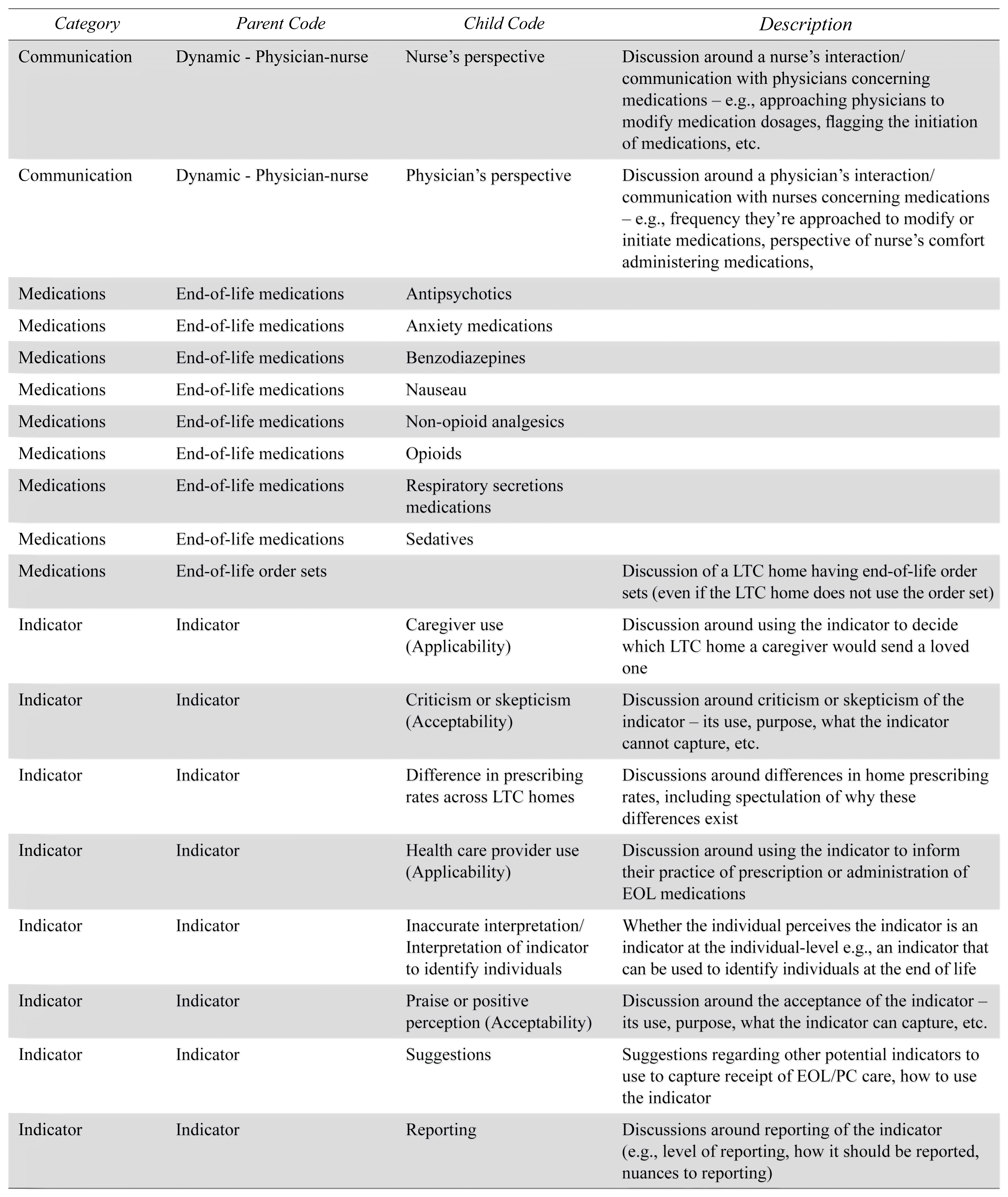 This qualitative study aimed to understand and inform the use of the end-of-life prescribing metric. Specifically, we aimed to determine the acceptability and applicability of the metric to assess the quality of residents’ end-of-life care. We interviewed LTC physicians, nurses, and bereaved caregivers of LTC residents to understand their perceptions of this metric.