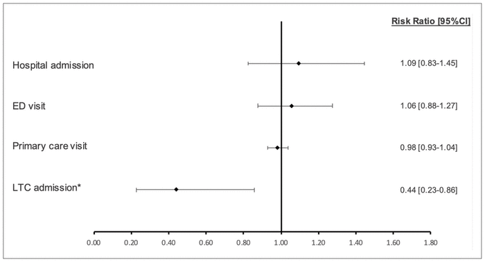 As shown in Figure 2, over the 180-day post-discharge period, we did not find statistically significant differences between SAFE Unit and Usual Care patients with respect to their risk of hospital readmissions (RR 1.09, 95% CI 0.83–1.45), ED visits (RR 1.06, 95% CI 0.88–1.27), or primary care visits (RR 0.98, 95% CI 0.93–1.04). We observed a significantly lower risk of entering an LTC home, by 55%, among SAFE Unit patients relative to those who received Usual Care (RR 0.44, 95% CI 0.23–0.86).
