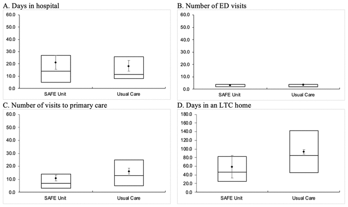 As shown in Figure 3, SAFE Unit patients had a similar median length of stay (LOS) in the hospital (SAFE: median 14 days, IQR 5–27 days; Usual Care: median 11.5 days, IQR 8–26 days) and a similar number of ED visits (SAFE: median 2 visits, IQR 2–4 visits; Usual Care: median 2 visits, IQR 1.5–4 visits) as Usual Care patients within 180 days post-discharge. However, SAFE Unit patients had significantly fewer primary care visits (SAFE: median 7 visits, IQR 3–14 visits; Usual Care: median 13 visits, IQR 5–25 visits) and spent fewer days in an LTC home (SAFE: median 46 days, IQR 24.5–82.5 days; Usual Care: median 85 days, IQR 45–142 days) than those who received Usual Care.
