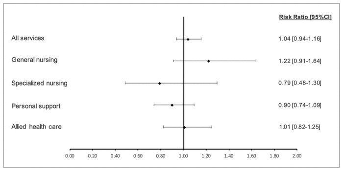 Overall, SAFE Unit and Usual Care group patients had a similar likelihood of using any home care within 180 days post-discharge (RR 1.04, 95% CI 0.94–1.16, Figure 4). SAFE Unit patients were slightly more likely to require general nursing care (RR 1.22, 95% CI 0.91–1.64) as well as allied health-care support (RR 1.01, 95% CI 0.82–1.25), though these were not statistically significant differences. Meanwhile, SAFE Unit patients were less likely to need specialized nursing care (RR 0.79, 95% CI 0.48–1.30) and personal support (RR 0.90, 95% CI 0.74–1.09). These differences were, again, not statistically significant.