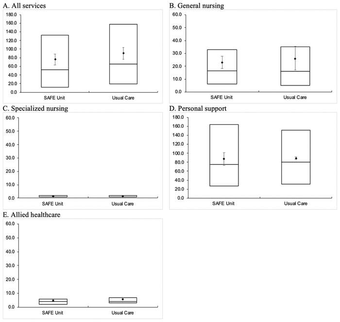 As shown in Figure 5, among those who used home care, on average, SAFE Unit patients had used significantly fewer days of service than those who received usual care; specifically, SAFE Unit patients had a median of 52 service days (IQR 12–132 days), compared to a median of 65.5 service days (IQR 19–158 days) among Usual Care patients. In terms of specific home-care services, we found significant differences in general nursing (SAFE: median 16.5 days, IQR 6–33 days; Usual Care: median 16 days, IQR 5–35 days) and personal support use (SAFE: median 75 days, IQR 27–164 days; Usual Care: median 80 days, IQR 31–151 days). The median number of service days did not differ in other categories of home-care services (i.e., specialized nursing and allied health care).