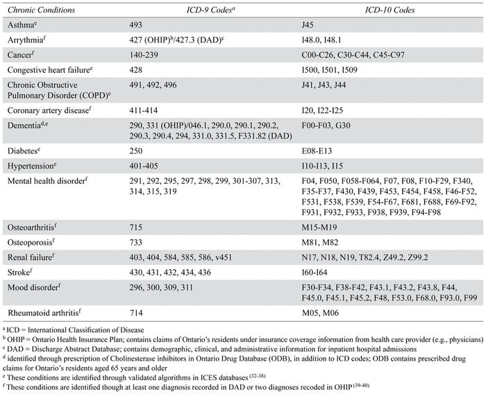The RPDB was used to capture baseline sociodemographic information (i.e., sex and age, rurality of residence, and neighbourhood income quintile). In addition to the variables captured in the propensity score matching, we also reported the prevalence of other relevant conditions, and number of chronic conditions (i.e., 0–2, 4, 5, 5, 6, 7+) to reflect the level of multimorbidity in this population (see Table 3); these include asthma, cancer, coronary heart disease, diabetes, hypertension, mood disorder, osteoarthritis, osteoporosis, renal failure, rheumatoid arthritis. The prevalence of these chronic conditions was ascertained using validated algorithms and relevant diagnostic codes in ICES datasets (see Table 1).