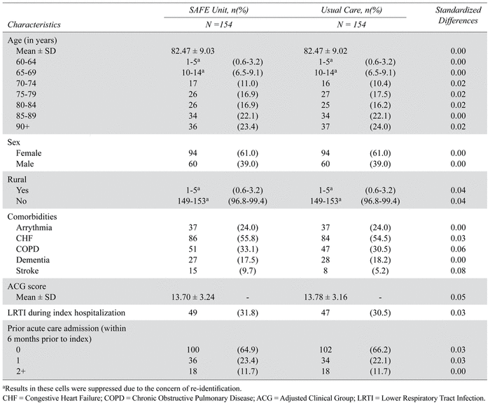 Table 2 presents the sociodemographic and health profiles of patients who received care in the SAFE Unit and Usual Care patients after matching; baseline characteristics prior to matching are included in Table 4. The mean age of the matched cohorts was 82.5 ± 9.0 years at discharge. The majority of patients are female (61%) and more than 97% resided in an urban area. In terms of conditions that are associated with the highest risk of hospital readmission, CHF (55.8% for SAFE vs. 54.5% for Usual Care), COPD (33.1% vs. 30.5%), and LRTIs (31.8% vs. 30.5%) were the most prevalent conditions. Most SAFE Unit and Usual Care patients did not have an acute care admission within six months before the index hospitalization (64.9% vs. 66.2%). In terms of the discharge location, SAFE Unit patients were more likely to be discharged home without home support (56.8%), compared to the control group (7.9%; Table 5). All baseline covariates were well-balanced with standardized differences that were less than or equal to 0.1. Additional baseline characteristics which were not used in the propensity score matching are reported in Table 3.