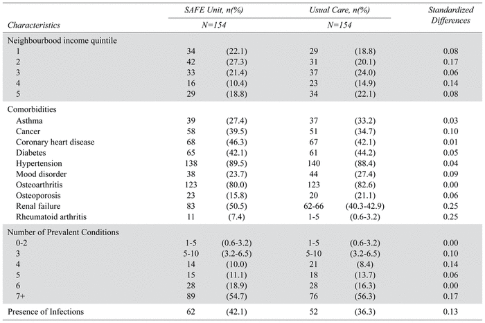 TABLE 4 Sociodemographic and health characteristics of patients who received care in the SAFE Unit and Usual Care, before propensity score matching