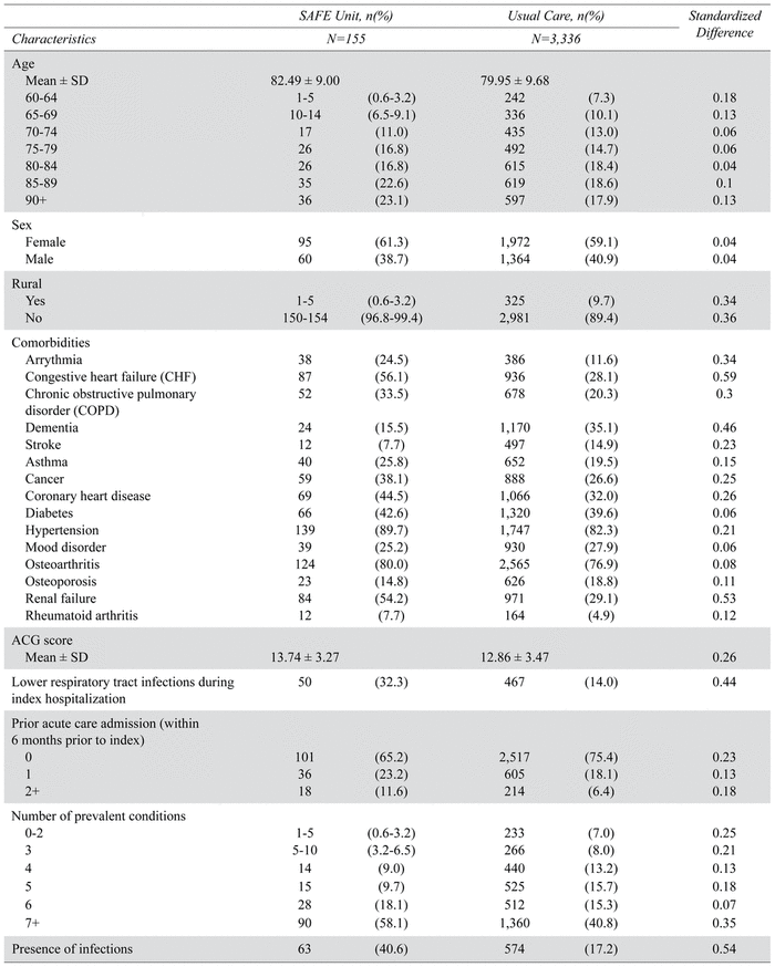 We reported frequencies, proportions, means (SD), and medians (interquartile ranges [IQR]) to compare baseline characteristics and outcomes of interest between SAFE Unit and Usual Care patients. We calculated risk ratios (RRs) between SAFE Unit and Usual Care patients using McNemar paired Chi-square test; a p value of less than .05 was considered as statistically significant. For means and medians, a standardized difference of greater than 0.1 was considered as statistically significant. All analyses were performed using SAS 9.4 (SAS Institute, Inc., Cary, NC).
