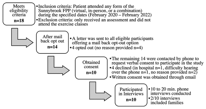 Our study focused on community-dwelling older adults enrolled in the Sunnybrook FPP during the COVID-19 pandemic (February 2020–February 2022). Purposive sampling was used. To be eligible, patients had to be 65 or older, at risk of falling, and capable of walking at least 25 metres and safely participating in supervised exercise. Patients attending any program format during this period (virtual, in-person, or hybrid) were included. To recruit participants, we contacted eligible patients (n=18) through a mailed letter with an opt-out option, followed by phone calls. One eligible patient declined due to difficulty hearing, one declined due to hospitalization, and six declined participation without a reported reason. A total of 10 individuals consented to participate. The participant recruitment process is outlined in Figure 2.