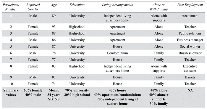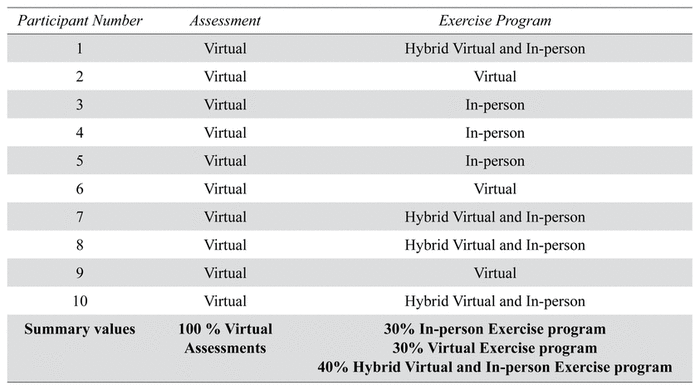 Study participants (n=10) were 60% female, had a mean age of 84 years (SD=5.8), primarily lived alone (60%), and were university educated (70%) (see Table 1A). With respect to living arrangements, 40% of participants reported living in an apartment/condominium, 30% in a house, and 20% in an independent living complex for seniors. Past employment included various positions in business, teaching, and banking. The participants experienced various forms of the program as it continuously evolved during the pandemic. All 10 participants received the initial assessment virtually by phone (conducted by the medical receptionist), followed by Zoom with both a geriatrician and physiotherapist. The exercise portion of the program was delivered in-person to 3/10 participants, virtually to 3/10, and a hybrid including both in-person and virtual session for the remaining 4/10 participants (Table 1B).