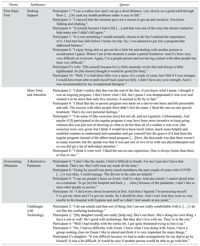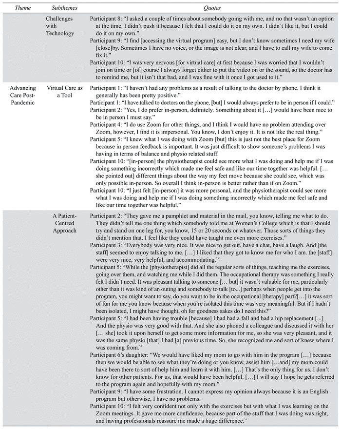 Our analysis generated three major themes. Theme 1, First Steps First, revealed a common desire for physical and mental support and the perceived essentials of a successful FPP, highlighting the importance of program length and individualized attention. Theme 2, Overcoming Obstacles, highlighted participants’ experiences overcoming barriers with technology in the context of an isolating pandemic. Theme 3, Advancing Care Post-Pandemic, elaborated on the appropriateness of virtual care and delved into the importance of program personalization. A list of supporting quotations is provided in Table 2.