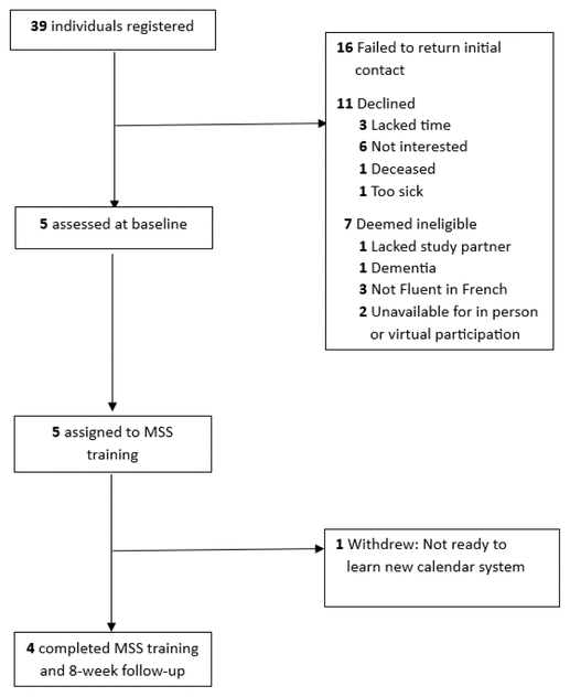 A pre/post intervention design (baseline, treatment end, and eight-week follow-up) was utilized. Inclusion criteria included age ≥50 years old; diagnosis of single or multi-domain MCI; Clinical Dementia Rating global (CDR) score of ≤0.5;(14) Montreal Cognitive Assessment (MoCA) score of ≥18;(15) available contact with a care partner ≥ two times weekly; a computer with access to the internet; and absence or stable intake of nootropic(s) for ≥ three months. Exclusion criteria included visual/hearing impairment, history of reading or written inability/disability sufficient to interfere with MSS training or concurrent participation in another related clinical trial. Participants were recruited in a memory clinic in Ottawa between January 2022 and February 2023. A total of 39 individuals were contacted to potentially participate in the study (Figure 1). The study was approved by the Bruyère Research Ethics Board (#M16-21-035) and preregistered at ClinicalTrials.gov (NCT05253365).