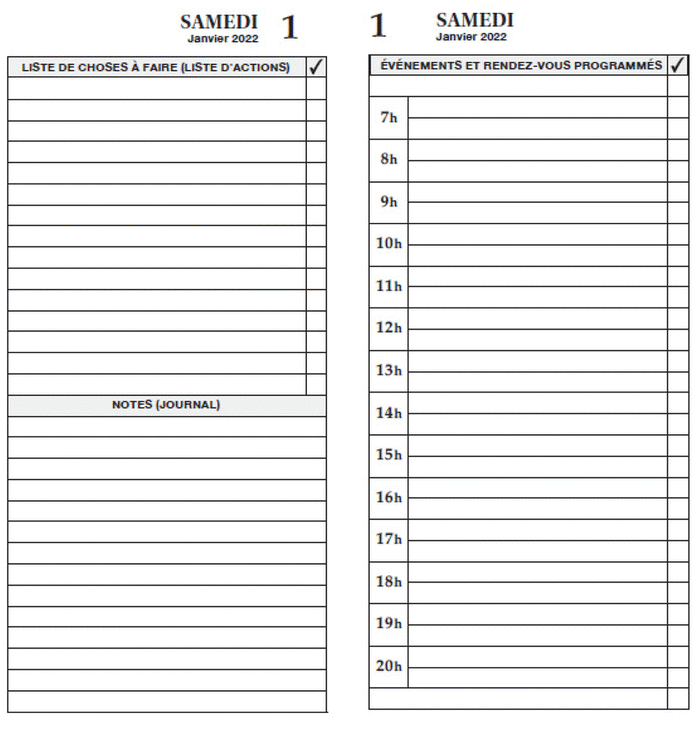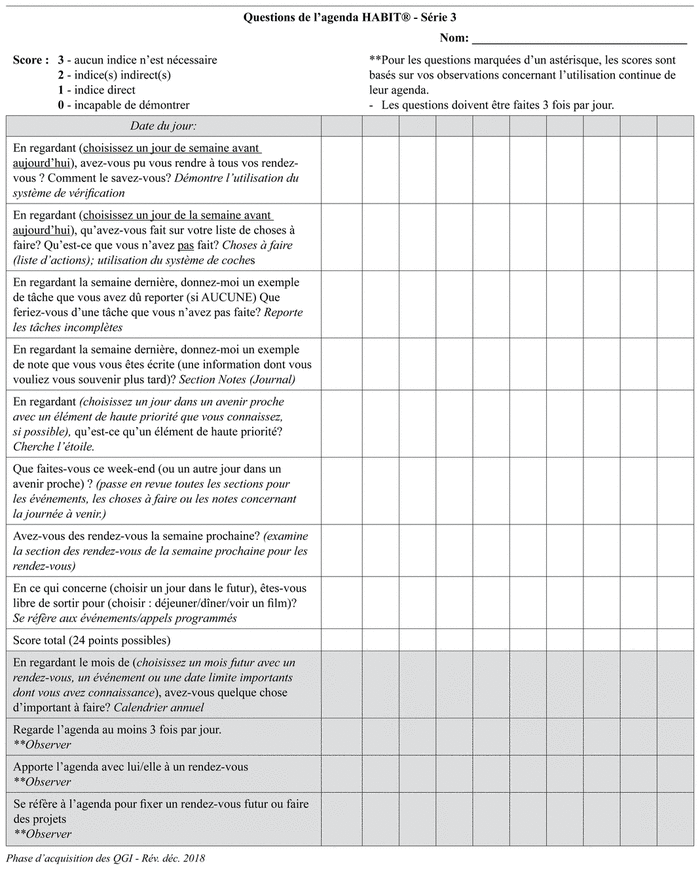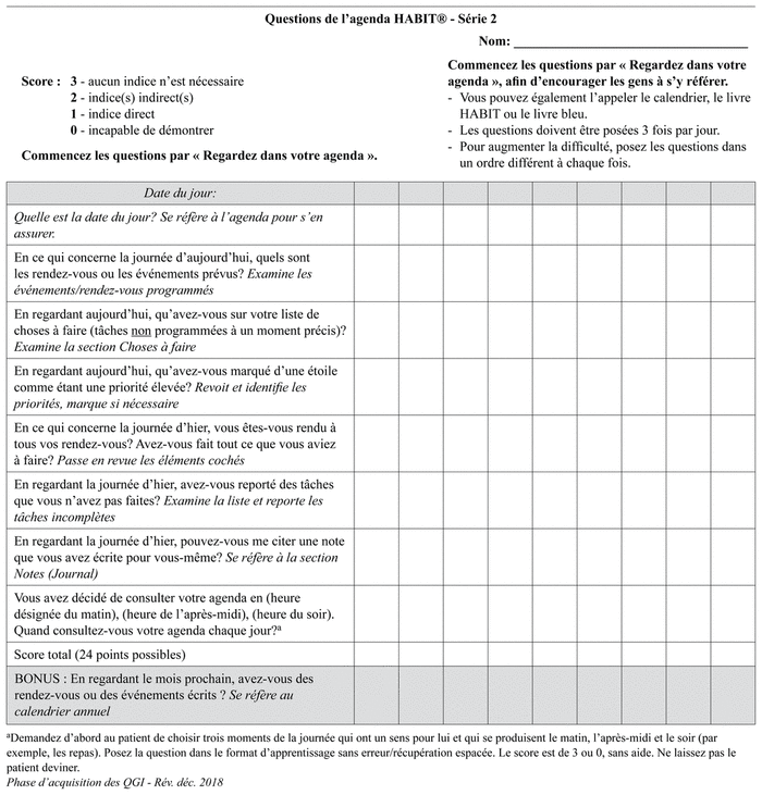 The MSS and its manualized training curriculum are described in detail in prior reports.(7,8) Briefly, the MSS is a pocket-sized calendar and note-taking system with three sections: (a) events; (b) to-do’s; and (c) journaling. The MSS training curriculum applies three stages from learning theory (acquisition, application, and adaptation),(16) and consists of ten 1-hour sessions delivered over two to six weeks starting seven to 10 days after baseline assessment. It includes orientation, modelling, practice use, and homework assignments to be completed with assistance from the care partner. Participants progress to the next stage after demonstrating 100% accuracy on the intervention plan/questions (IPQs) for two consecutive days (see Appendix A for an example of the two-page-per-day calendar in French and Appendix B for the IPQs). The MSS trainer was a master’s level research coordinator (J.F.) supervised by a licensed psychologist (O.A.S.). After the intervention, each participant and their partner completed a semi-structured interview to provide suggestions for improving the MSS. The intervention only used the MSS training. One participant completed the MSS training virtually, through the Zoom platform, and three other participants had a combination of in-person and virtual sessions.