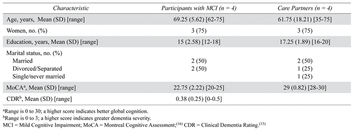 The final enrollment rate was 12.82% (n=5), with an 80% (n=4) retention rate for both the intervention and eight-week follow-up. Table 1 presents the characteristics of the study sample, comprising four participants with MCI and their care partners. Of the care partners, two were spouses, one a daughter, and another a friend. All participants and care partners self-identified as of European descent.