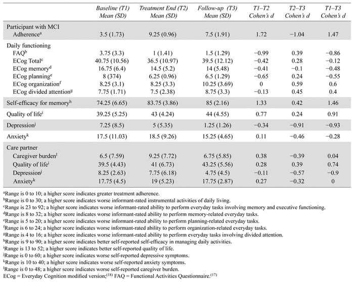 Table 2 presents outcome variable scores for participants with MCI and their care partners at baseline (T1), treatment end (T2), and eight-week follow-up (T3). Treatment adherence scores rose from T1 to T2, slightly decreased at T3 but remained higher than at T1. The percentage of adherent MCI participants at each assessment point: 0% at T1, 100% at T2, and 75% at T3. FAQ scores decreased from T1 to T2 and stayed stable at T3. ECog total score and memory- and planning-related subscale scores dropped from T1 to T2; while the former returned to baseline, the latter remained steady from T2 to T3. ECog organization and divided attention subscale scores remained stable from T1 to T2 and slightly increased from T2 to T3. In participants with MCI, self-efficacy for memory and quality of life scores increased from T1 to T3, while anxiety and depressive symptoms decreased. Caregiver burden increased from T1 to T2 but nearly returned to baseline at T3. For care partners, quality of life increased and depressive symptoms decreased from T1 to T3, with anxiety symptoms remaining relatively unchanged.