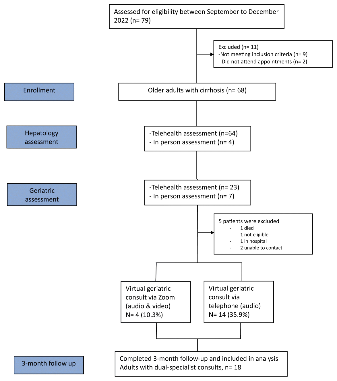 Twenty-three participants were referred for a virtual CGA, with 18 undergoing a virtual CGA. After promoting videoconference as the modality of choice, 14 participants reported a lack of home access to a computer, tablet or smart phone. Four participants underwent simultaneous video and audio consultation via Zoom. Twelve participants had mixed telephone and in-person visits, with the hepatology consult being telephone or Zoom and were waitlisted for in-person geriatric consult. Fifteen patients received outpatient physiotherapy referrals and four received referrals for nutritional education with dietician.