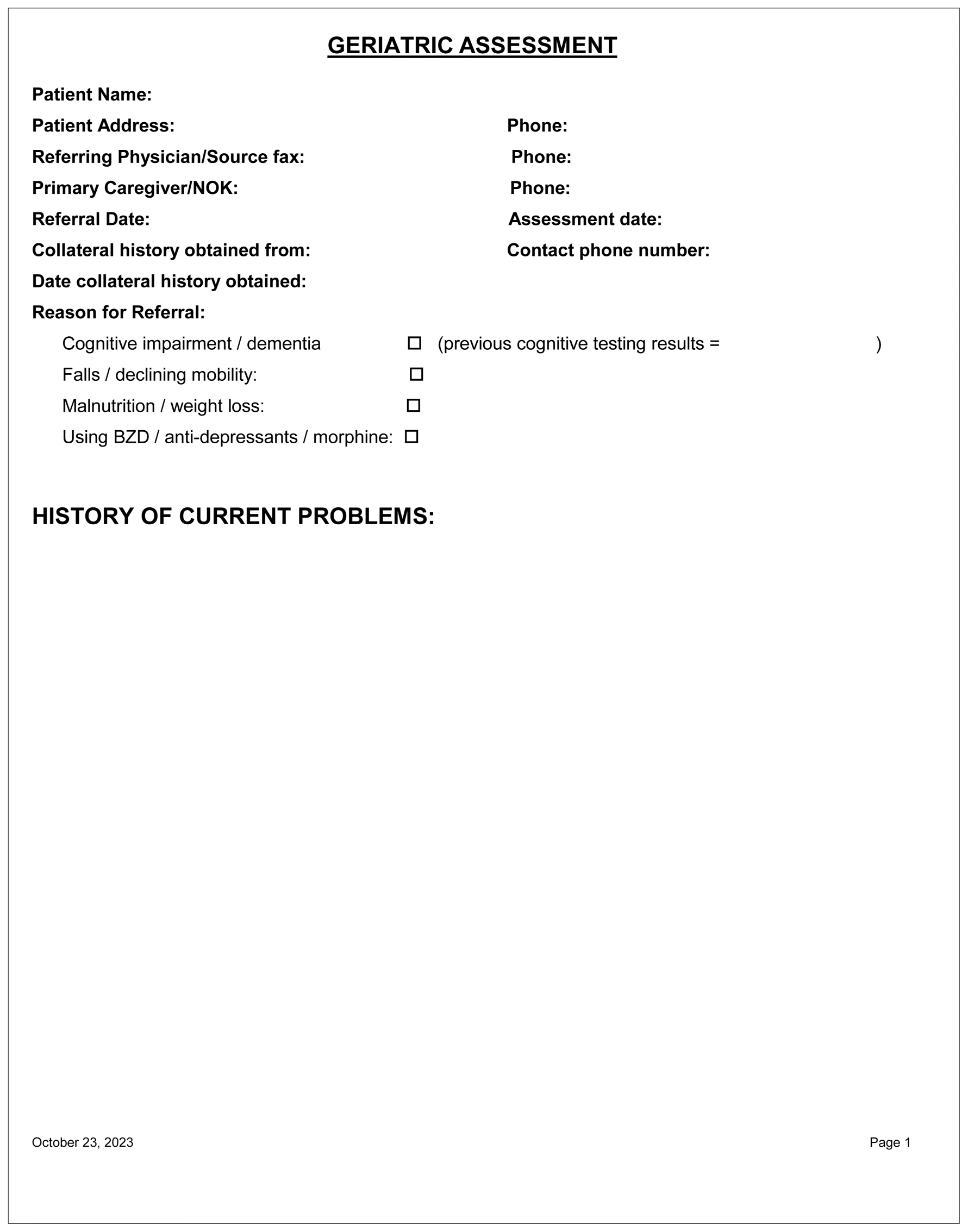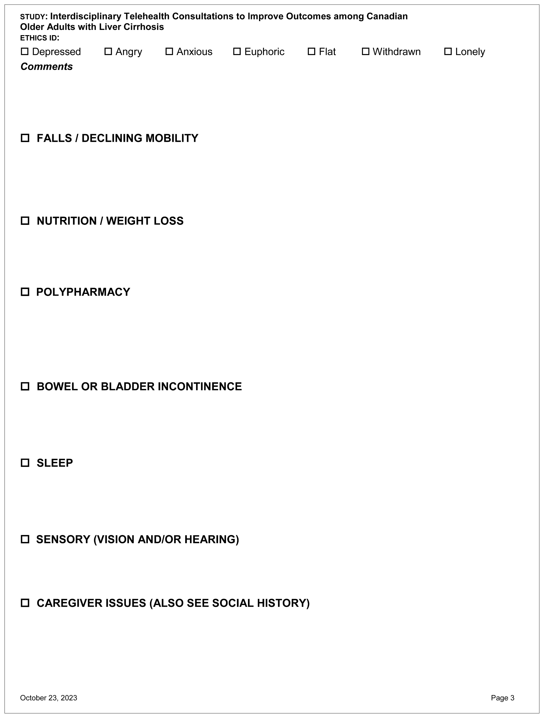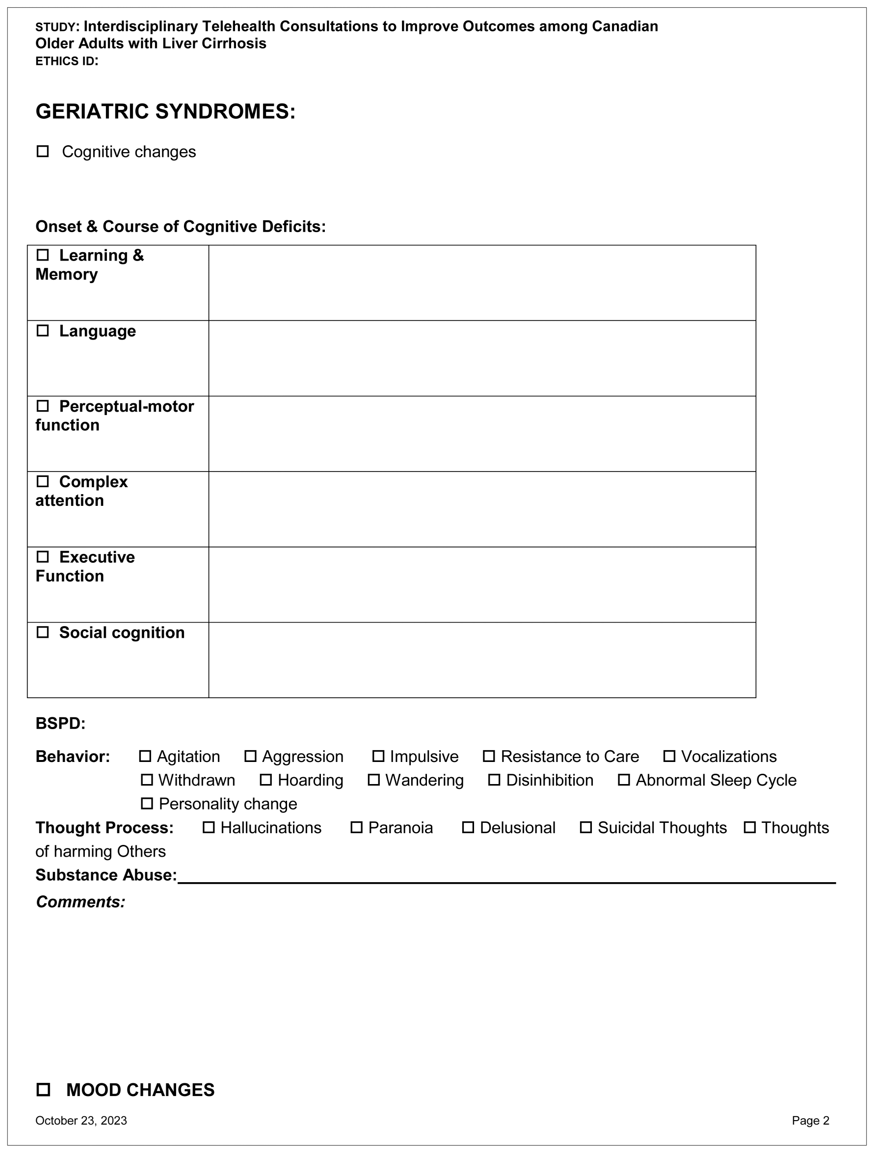 The intervention involved the implementation of a new Hep-GRP Care Pathway for eligible older adults with cirrhosis (Figure 1). The Hep-GRP Care pathway involved screening older adults with cirrhosis for the presence of five pre-specified geriatric syndromes, with a positive finding prompting an electronic referral (using a standardized electronic referral form) to be sent to a geriatrician for a virtual or in person CGA. When deemed appropriate, the appointment was made with the patient by a specified geriatrician, by videoconference where possible, otherwise by telephone, within two weeks from the time of referral. An in-person geriatric consult was requested if patient was not candidate for a virtual visit. The virtual appointment involved completion of a modified virtual CGA using a problem-based standardized template (Figure 2). Nutritional screening tool SCREEN-8 tool and the Saint Louis University Mental Status examination (SLUMS) were administered by videoconference or telephone. Collateral history was obtained either before, during or after the appointment, where possible. A consultation letter with the CGA results was sent to the referring hepatologist and family physician, which included a problem list and recommendations, including recommendation for any geriatric follow-up visit. Depending on the CGA findings, multidisciplinary clinic visits were then arranged at the discretion of the referring physicians when appropriate.