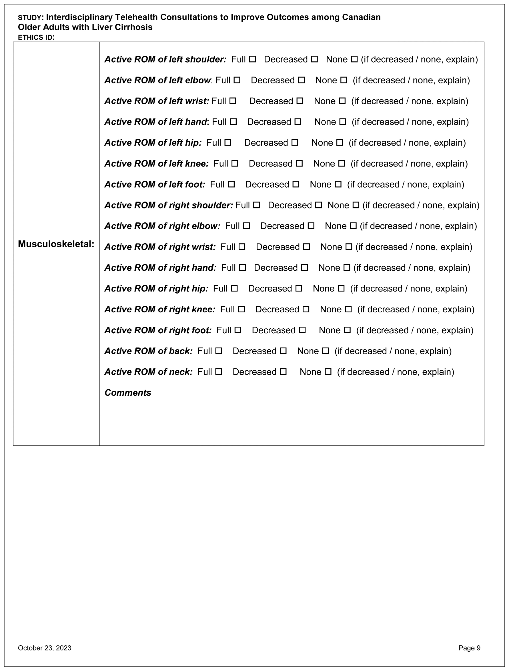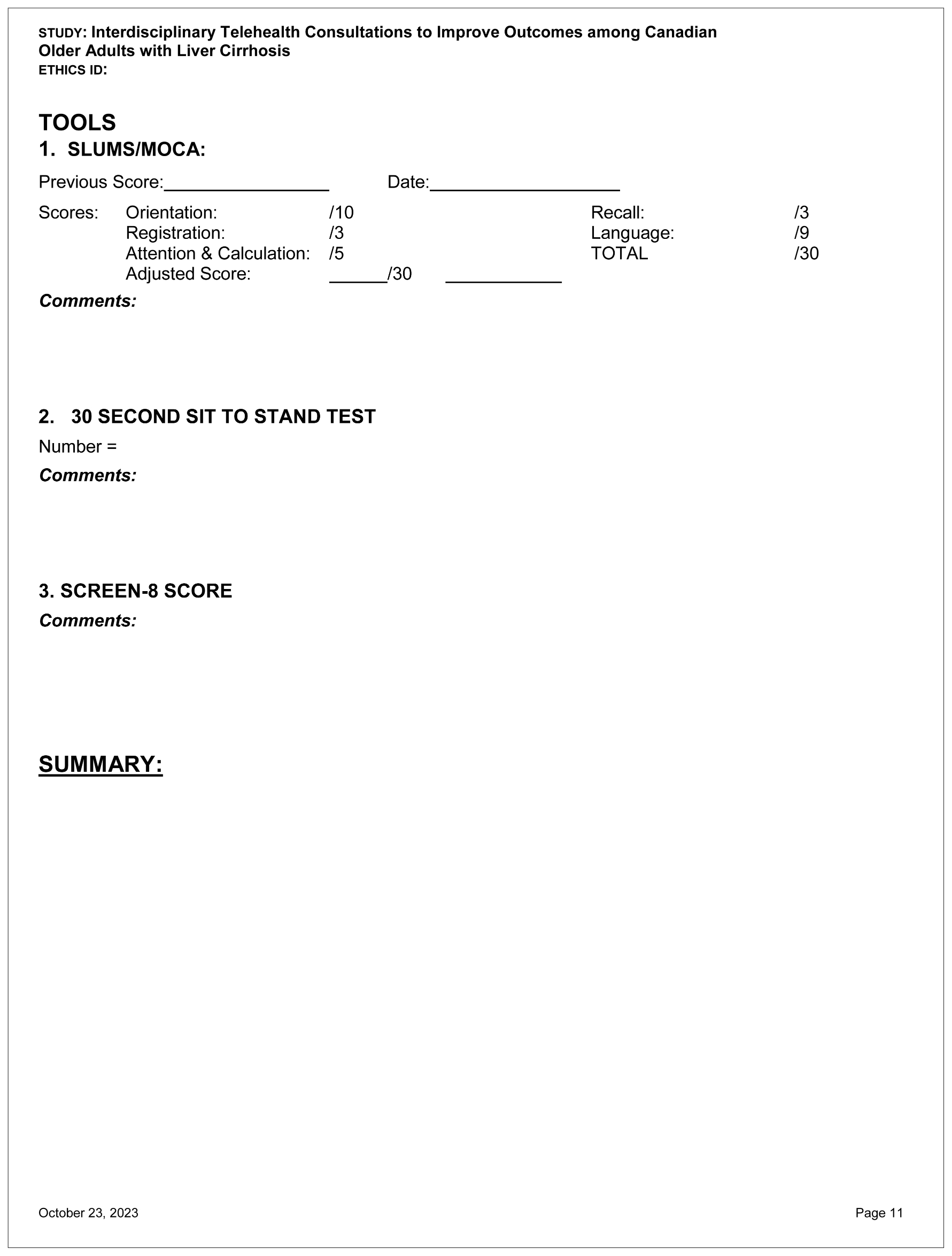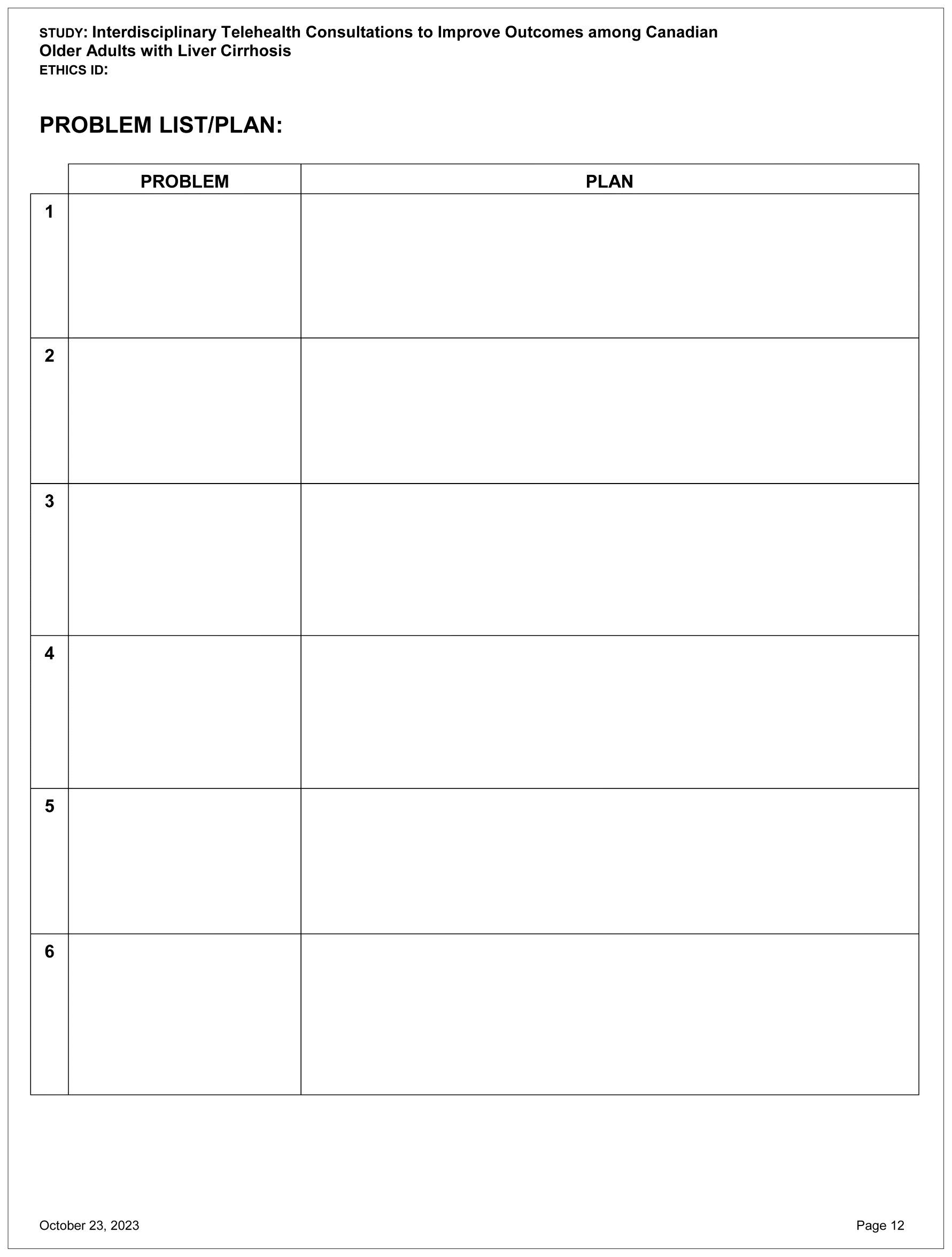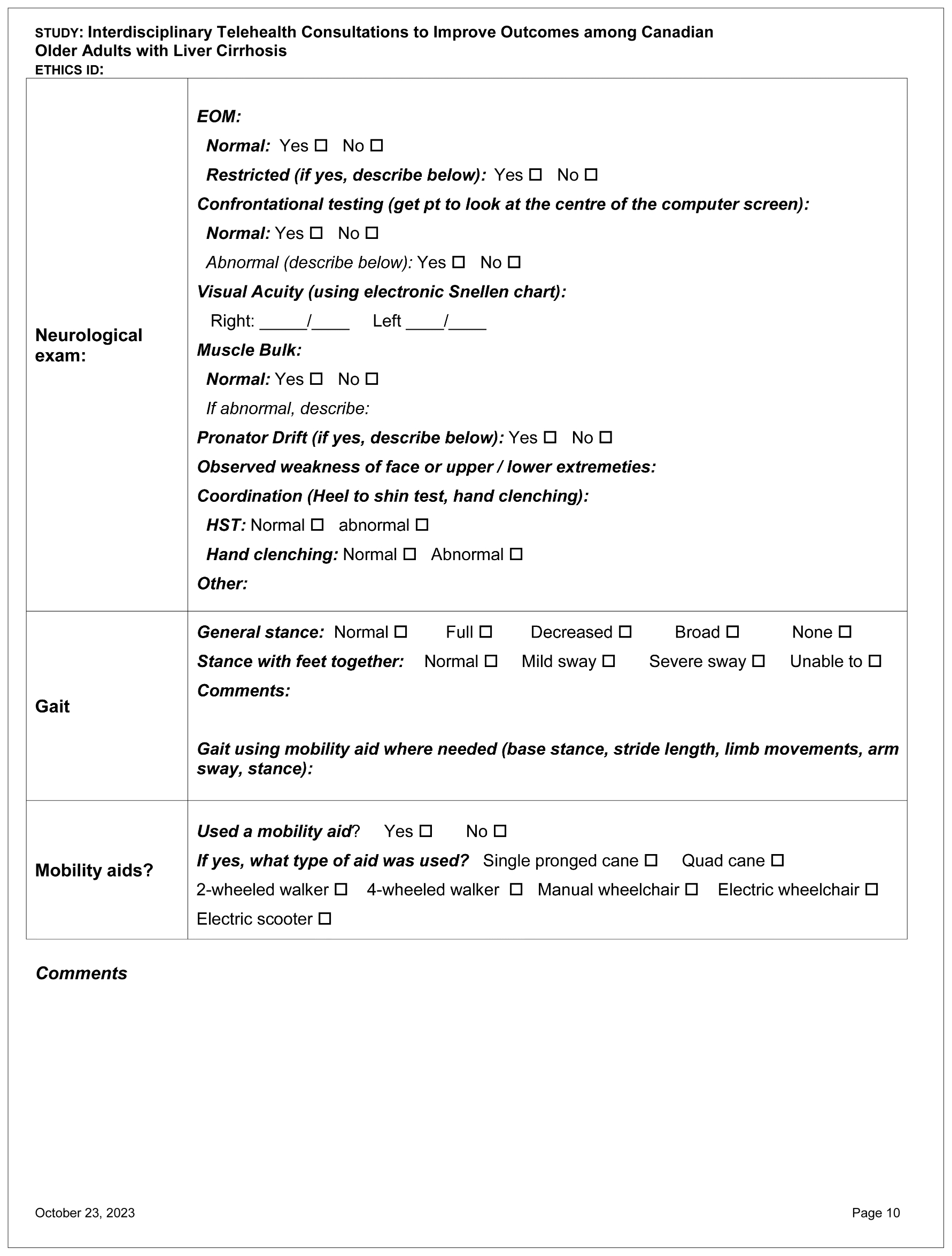 The intervention involved the implementation of a new Hep-GRP Care Pathway for eligible older adults with cirrhosis (Figure 1). The Hep-GRP Care pathway involved screening older adults with cirrhosis for the presence of five pre-specified geriatric syndromes, with a positive finding prompting an electronic referral (using a standardized electronic referral form) to be sent to a geriatrician for a virtual or in person CGA. When deemed appropriate, the appointment was made with the patient by a specified geriatrician, by videoconference where possible, otherwise by telephone, within two weeks from the time of referral. An in-person geriatric consult was requested if patient was not candidate for a virtual visit. The virtual appointment involved completion of a modified virtual CGA using a problem-based standardized template (Figure 2). Nutritional screening tool SCREEN-8 tool and the Saint Louis University Mental Status examination (SLUMS) were administered by videoconference or telephone. Collateral history was obtained either before, during or after the appointment, where possible. A consultation letter with the CGA results was sent to the referring hepatologist and family physician, which included a problem list and recommendations, including recommendation for any geriatric follow-up visit. Depending on the CGA findings, multidisciplinary clinic visits were then arranged at the discretion of the referring physicians when appropriate.