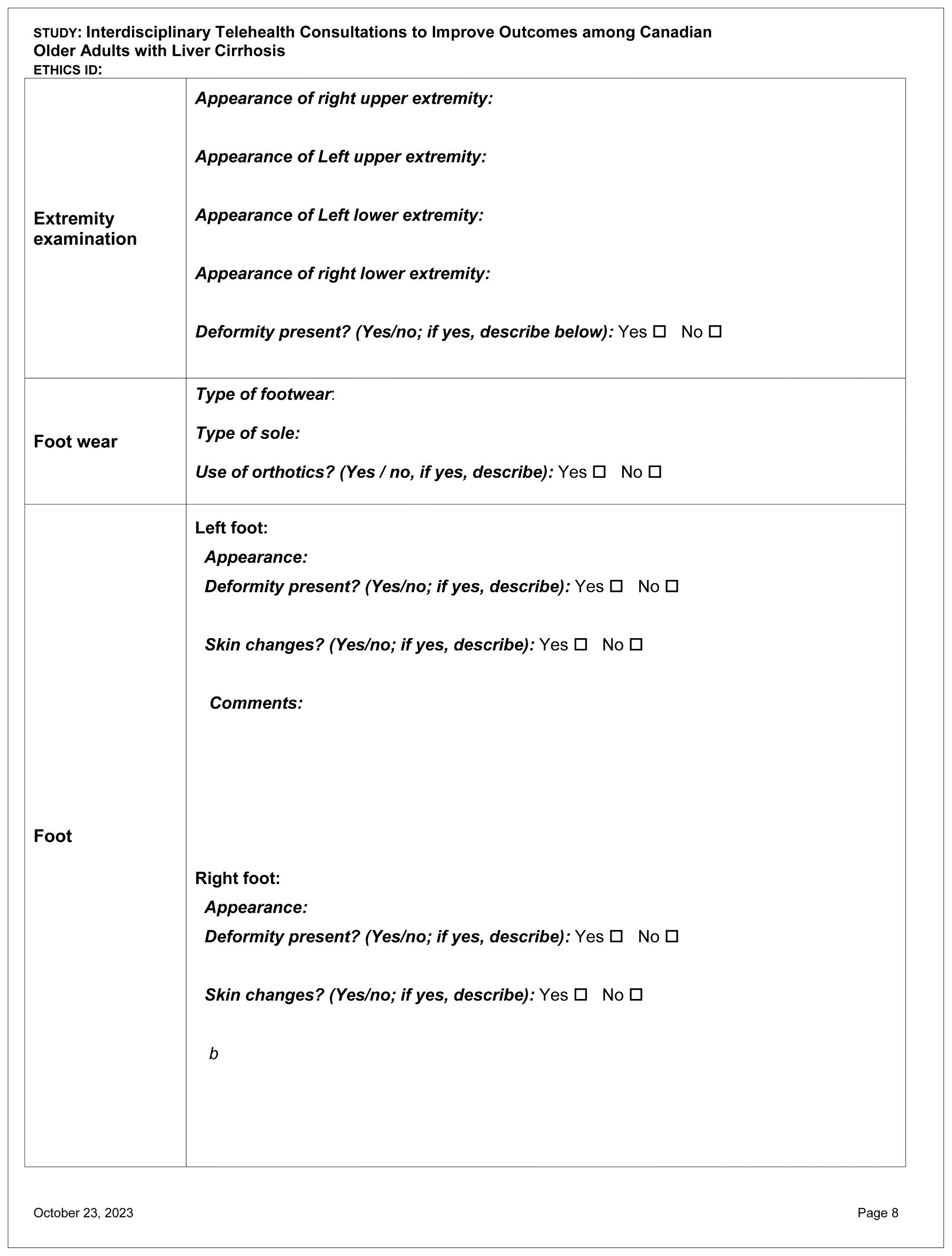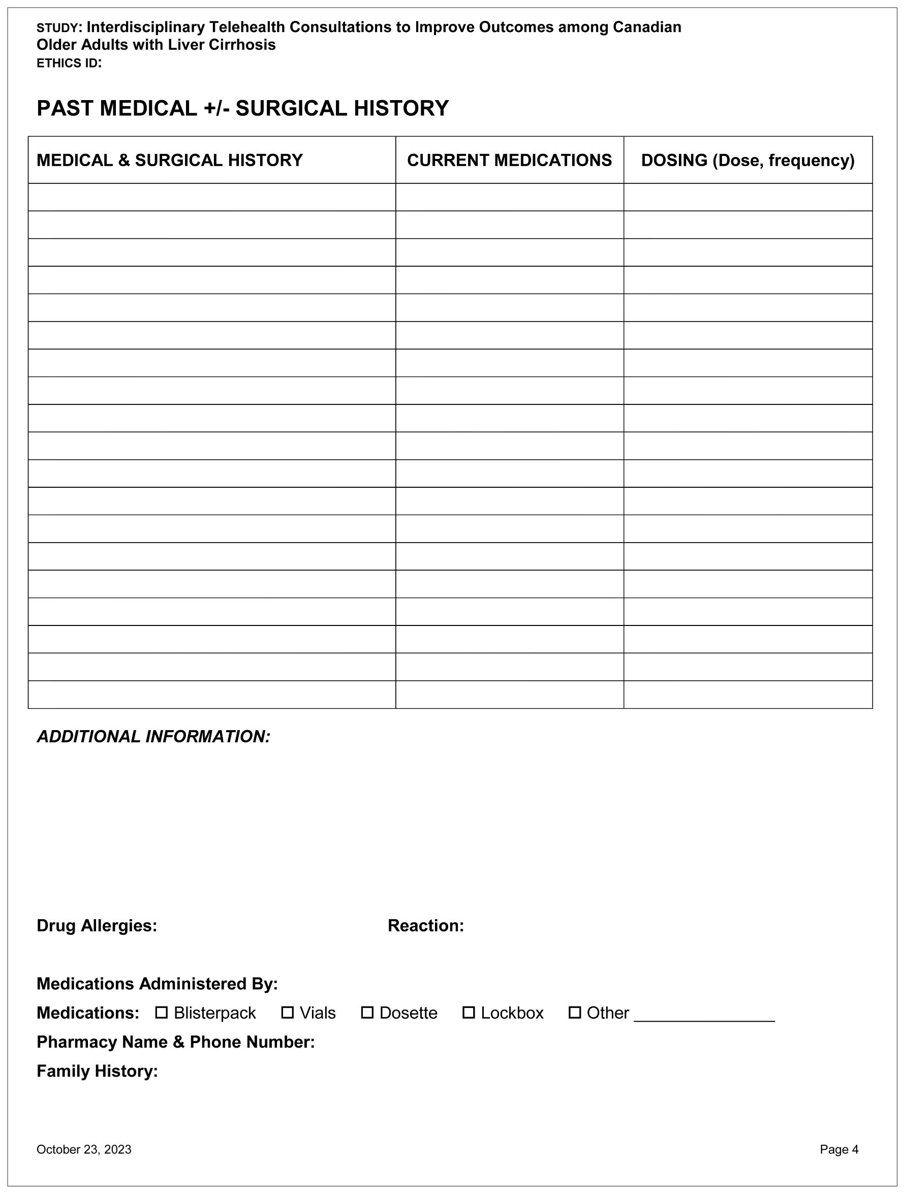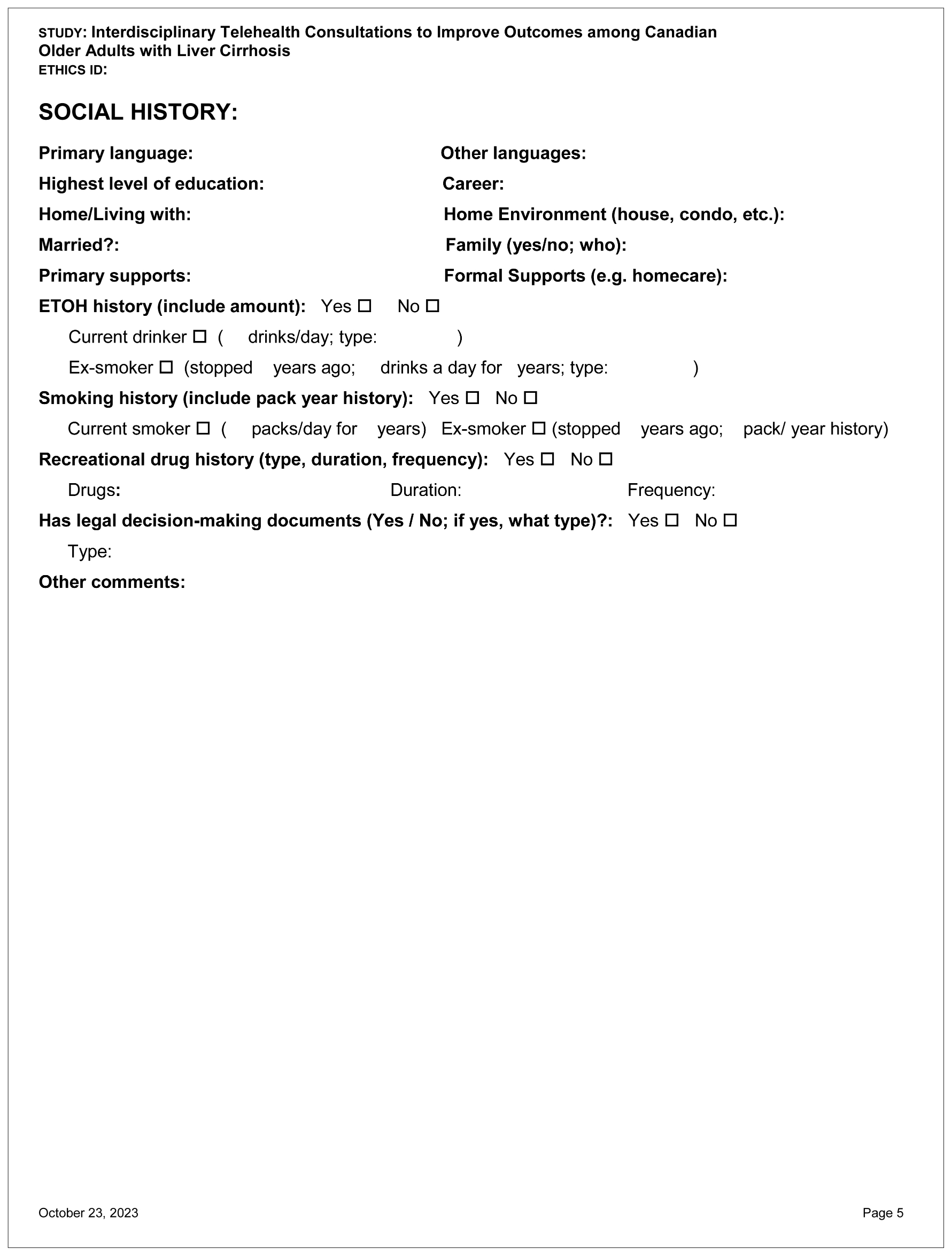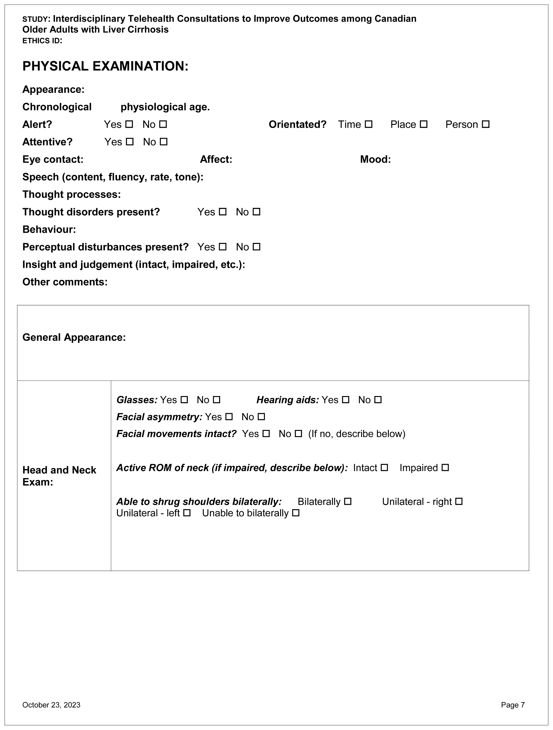 Eligible participants were new referrals to the Halifax hepatology clinic at the Queen Elizabeth II Health Science Centre who were aged 65 years or older, had a diagnosis of liver cirrhosis confirmed by either liver biopsy, liver stiffness test (Fibroscan or MR elastography) or using the serum fibrosis test (FIB-4 score), with appropriate radiological findings, and had had no prior hepatologist contact. Individuals were excluded if they had limited life expectancy at less than six months from metastatic cancer or life-threatening conditions, or were unable to provide consent.