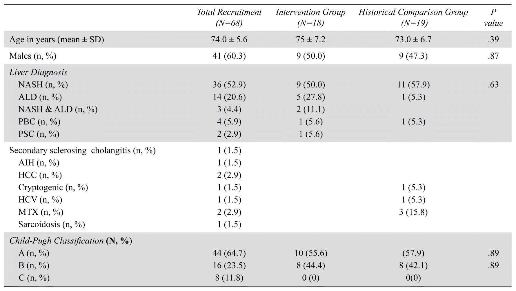 The historical comparison group was consisted of 19 subjects with mean age of 73.0 years and 47.4% males (N=9) (Table 1). 57.9% had Child Pugh A liver cirrhosis (N=11) and 42.1% (N=8) were of Child-Pugh B status. A total of 21 liver related ED visits occurred in the three-month follow up period, averaging 1.1 ER visit per patient (SD 0.30, 95% CI 0.46–1.75). There were five hospital admissions in the same period.