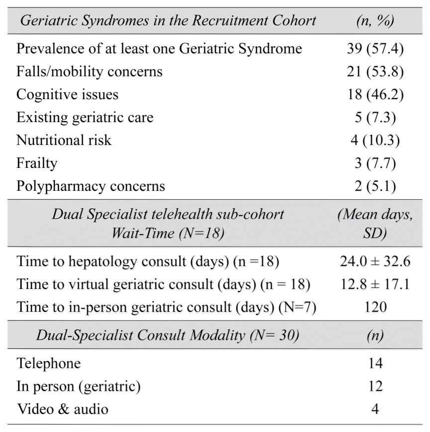 The mean wait-time from referral to hepatology consultation was 24.0 days. The mean wait-time from referral to a virtual CGA was 12.8 days vs. 120 days for an in-person CGA within Halifax. The seven patients who were referred for an in-person geriatric assessment, either after their virtual CGA or new referral to geriatrics, were still on the in-person geriatric waiting list at the time of study completion.