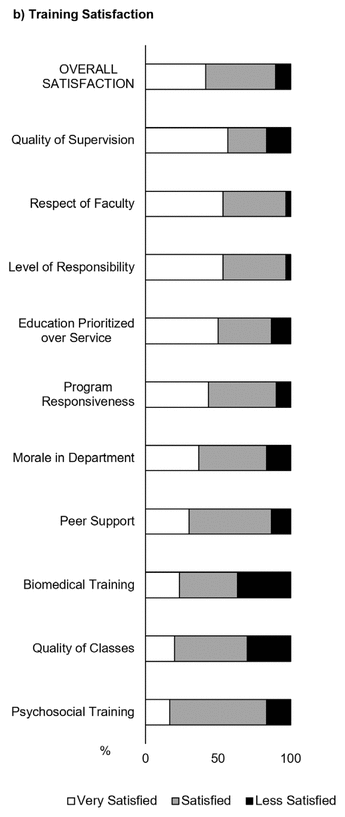 Figure 1B shows geriatric psychiatry residents’ training satisfaction. Geriatric psychiatry residents reported high “Overall Satisfaction with Residency Training” (89.7% of survey participants reported being “Very Satisfied’’ or “Satisfied”). Trainees were most satisfied with the “Quality of Supervision” (56.7% “Very Satisfied”), the “Respect of Faculty for Residents”, and the “Responsibility given to Residents for Patient Care” (both 53.3% “Very Satisfied”). Trainees were least satisfied with “Training in Biomedical Psychiatry” and the “Quality of Teaching Conferences” (36.7% and 30.0% of them were “Less Satisfied”, respectively).
