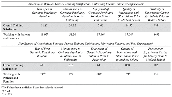 TABLE 1 The association between overall training satisfaction and past experiences with older adults and geriatrics; “Working with patients and families” is significantly associated with “Enjoyment of Geriatric Psychiatry Rotation Prior to Fellowship” and “Quality of Interactions with Older Adults Prior to Medical School”