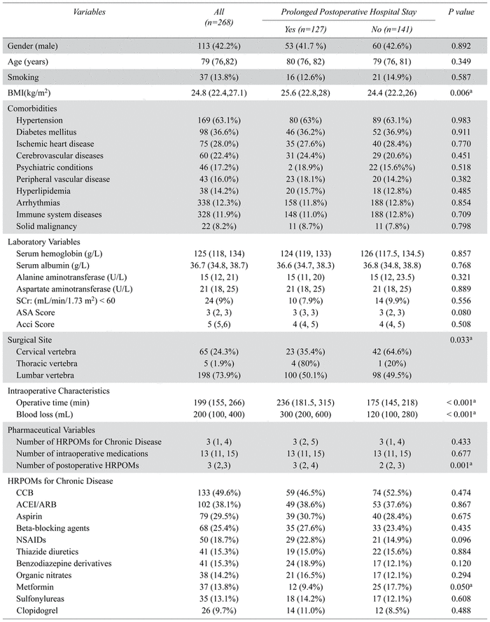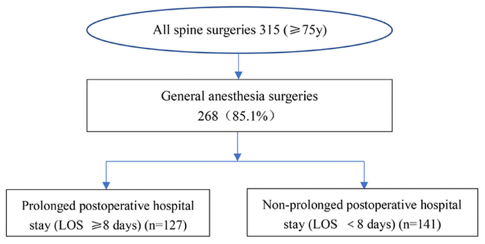 A total of 268 patients aged ≥ 75 years out of 315 who underwent spinal surgery were included. Of these, 47 were excluded because of surgery under epidural anesthesia (Figure 1). The demographic and clinical characteristics were shown in Table 1. The median age of the patients was 79 years (interquartile range, IQR = 76, 82), 42.2% of whom were male and had a mean (± standard deviation) BMI of 24.9 (±3.6) kg/m2. The median postoperative LOS was 8 (IQR = 7, 13) days. There were 127 (47.4%) patients with prolonged postoperative LOS.